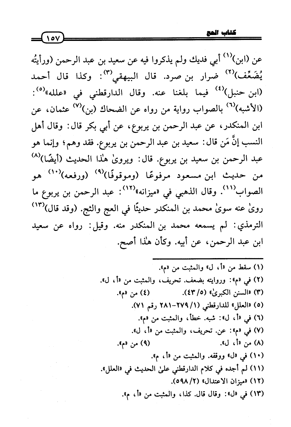عَن (ابْن) أبي فديك وَلم يذكرُوا فِيهِ عَن سعيد بن عبد الرَّحْمَن (ورأيتُه يُضَعِّف) ضرار بن صرد. قَالَ الْبَيْهَقِيّ: وَكَذَا قَالَ أَحْمد (بن حَنْبَل) فِيمَا بلغنَا عَنهُ. وَقَالَ الدَّارَقُطْنِيّ فِي «علله» : (الْأَشْبَه) بِالصَّوَابِ رِوَايَة من رَوَاهُ عَن الضَّحَّاك (بن) عُثْمَان، عَن ابْن الْمُنْكَدر، عَن عبد الرَّحْمَن بن يَرْبُوع، عَن أبي بكر قَالَ: وَقَالَ أهل النّسَب إنَّ مَن قَالَ: سعيد بن عبد الرَّحْمَن بن يَرْبُوع. فقد وهم؛ وَإِنَّمَا هُوَ عبد الرَّحْمَن بن سعيد بن يَرْبُوع. قَالَ: وَيروَى هَذَا الحَدِيث (أَيْضا) من حَدِيث ابْن مَسْعُود مَرْفُوعا (وموقوفًا) (وَرَفعه) هُوَ الصَّوَاب. وَقَالَ الذَّهَبِيّ فِي «مِيزَانه» : عبد الرَّحْمَن بن يَرْبُوع مَا رَوَى عَنهُ سُوَى مُحَمَّد بن الْمُنْكَدر حَدِيثا فِي العج والثج. (وَقد قَالَ) التِّرْمِذِيّ: لم يسمعهُ مُحَمَّد بن الْمُنْكَدر مِنْهُ. وَقيل: رَوَاهُ عَن سعيد بن عبد الرَّحْمَن، عَن أَبِيه. وَكَأن هَذَا أصح.