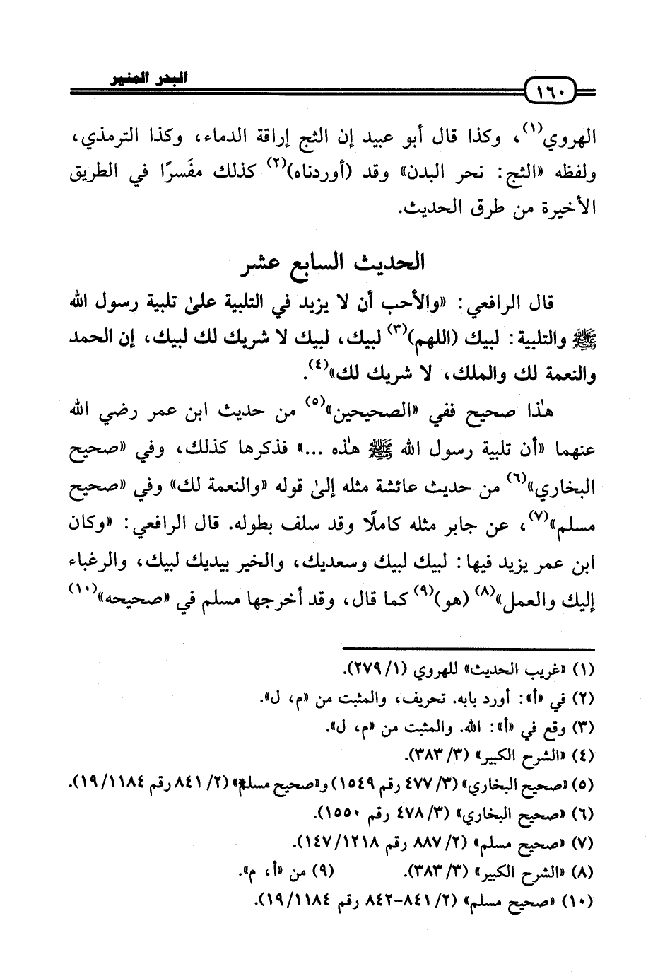 هَذَا صَحِيح فَفِي «الصَّحِيحَيْنِ» من حَدِيث ابْن عمر رَضِيَ اللَّهُ عَنْهما «أَن تَلْبِيَة رَسُول الله - صَلَّى الله عَلَيْهِ وَسلم - هَذِه ... » فَذكرهَا كَذَلِك، وَفِي «صَحِيح البُخَارِيّ» من حَدِيث عَائِشَة مثله إِلَى قَوْله «وَالنعْمَة لَك» وَفِي «صَحِيح مُسلم» ، عَن جَابر مثله كَامِلا وَقد سلف بِطُولِهِ. قَالَ الرَّافِعِيّ: «وَكَانَ ابْن عمر يزِيد فِيهَا: لبيْك لبيْك وَسَعْديك، وَالْخَيْر بيديك لبيْك، وَالرغْبَاء إِلَيْك وَالْعَمَل» (هُوَ) كَمَا قَالَ، وَقد أخرجهَا مُسلم فِي «صَحِيحه»