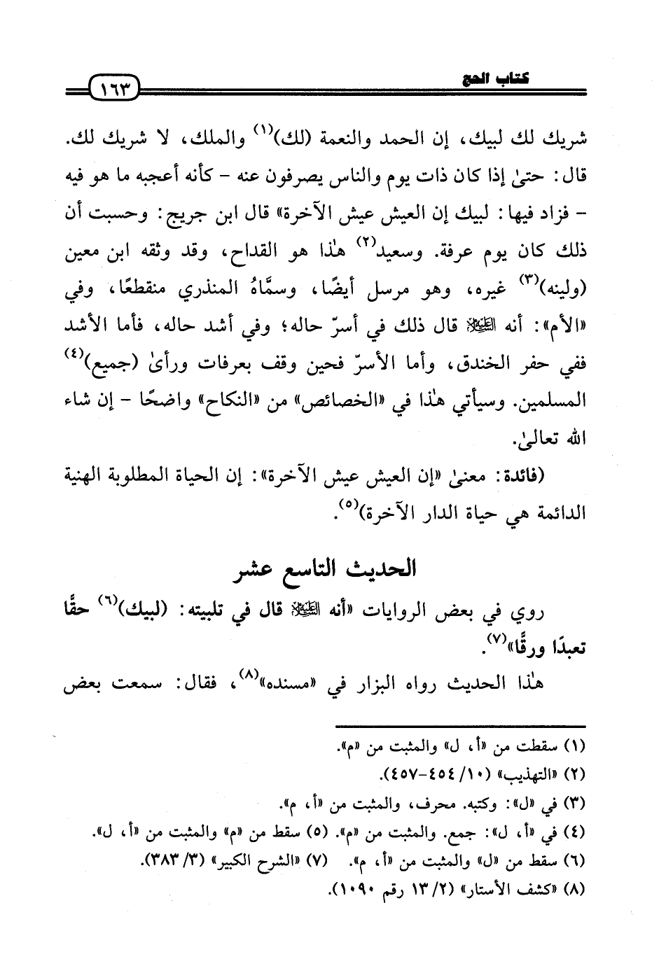 شريك لَك لبيْك، إِن الْحَمد وَالنعْمَة (لَك) وَالْملك، لَا شريك لَك. قَالَ: حَتَّى إِذا كَانَ ذَات يَوْم وَالنَّاس يصرفون عَنهُ - كَأَنَّهُ أعجبه مَا هُوَ فِيهِ - فَزَاد فِيهَا: لبيْك إِن الْعَيْش عَيْش الْآخِرَة» قَالَ ابْن جريج: وحسبت أَن ذَلِك كَانَ يَوْم عَرَفَة. وَسَعِيد هَذَا هُوَ القداح، وَقد وَثَّقَهُ ابْن معِين (وَلينه) غَيره، وَهُوَ مُرْسل أَيْضا، وسمَّاهُ الْمُنْذِرِيّ مُنْقَطِعًا، وَفِي «الْأُم» : أَنه عَلَيْهِ السَّلَام قَالَ ذَلِك فِي أسرّ حَاله؛ وَفِي أَشد حَاله، فَأَما الأشد فَفِي حفر الخَنْدَق، وَأما الأسرّ فحين وقف بِعَرَفَات وَرَأَى (جَمِيع) الْمُسلمين. وَسَيَأْتِي هَذَا فِي «الخصائص» من «النِّكَاح» وَاضحا - إِن شَاءَ الله تَعَالَى.