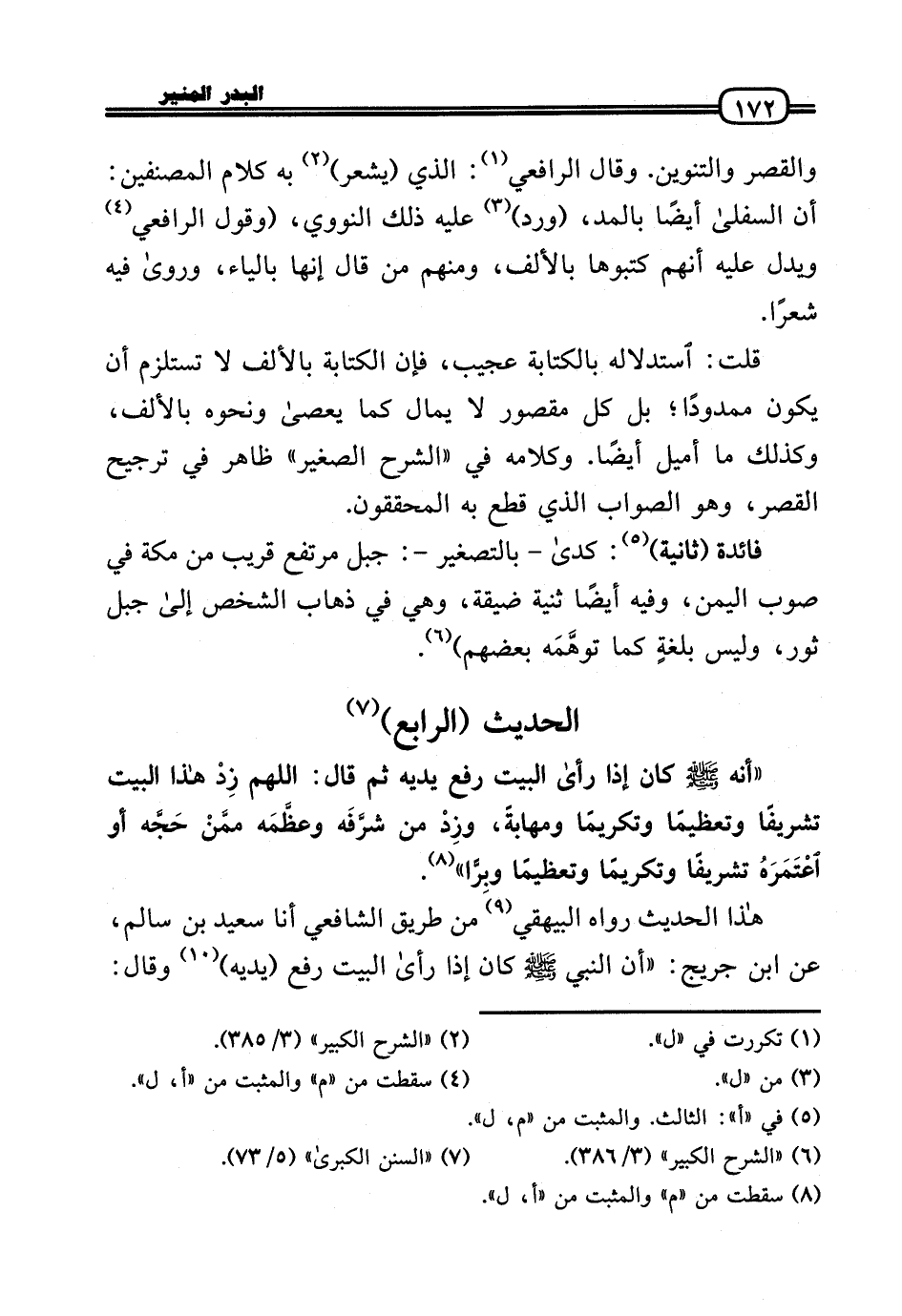 هَذَا الحَدِيث رَوَاهُ الْبَيْهَقِيّ من طَرِيق الشَّافِعِي أَنا سعيد بن سَالم، عَن ابْن جريج: «أَن النَّبِي - صَلَّى الله عَلَيْهِ وَسلم - كَانَ إِذا رَأَى الْبَيْت رفع (يَدَيْهِ) وَقَالَ: