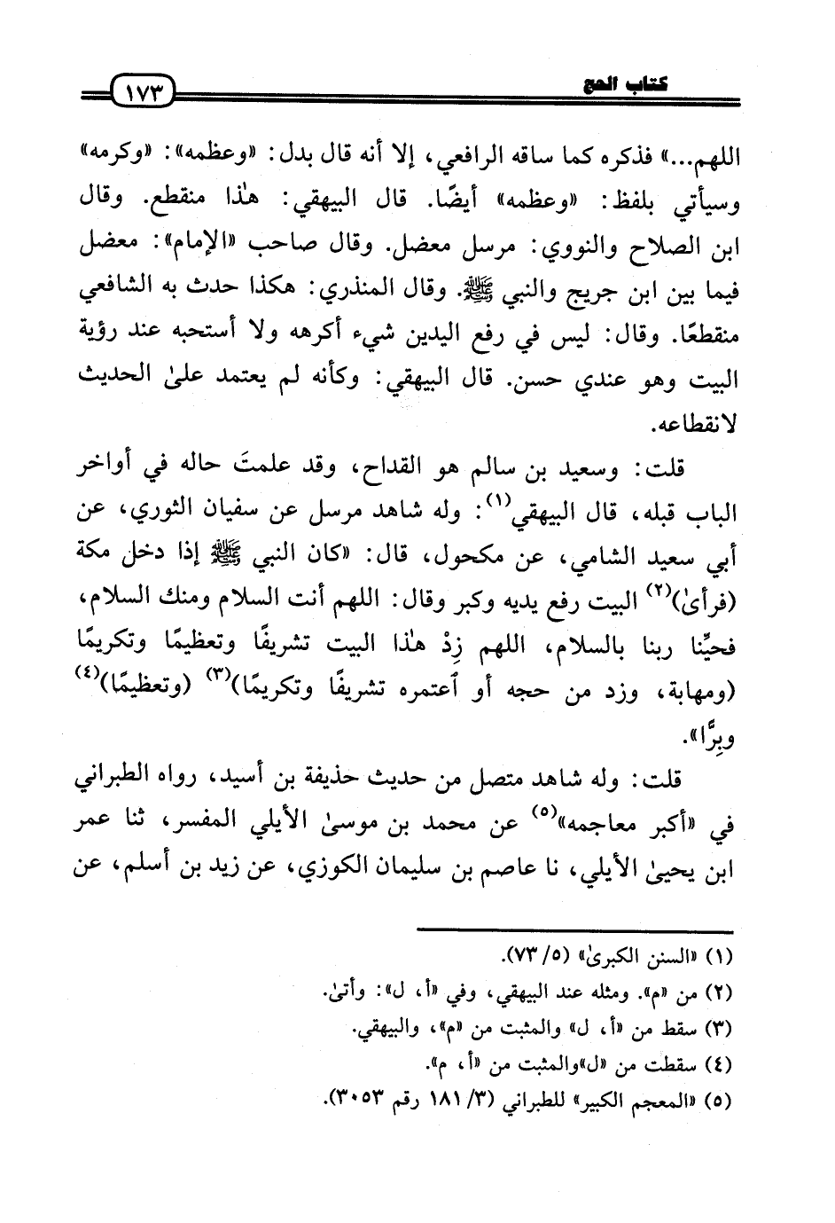 قلت: وَسَعِيد بن سَالم هُوَ القداح، وَقد علمتَ حَاله فِي أَوَاخِر الْبَاب قبله، قَالَ الْبَيْهَقِيّ: وَله شَاهد مُرْسل عَن سُفْيَان الثَّوْريّ، عَن أبي سعيد الشَّامي، عَن مَكْحُول، قَالَ: «كَانَ النَّبِي - صَلَّى الله عَلَيْهِ وَسلم - إِذا دخل مَكَّة (فَرَأَى) الْبَيْت رفع يَدَيْهِ وَكبر وَقَالَ: اللَّهُمَّ أَنْت السَّلَام ومنك السَّلَام، فحيِّنا رَبنَا بِالسَّلَامِ، اللَّهُمَّ زِدْ هَذَا الْبَيْت تَشْرِيفًا وتعظيمًا وتكريمًا (ومهابة، وزد من حجه أَو اعتمره تَشْرِيفًا وتكريمًا) (وتعظيمًا) وبِرًّا» .