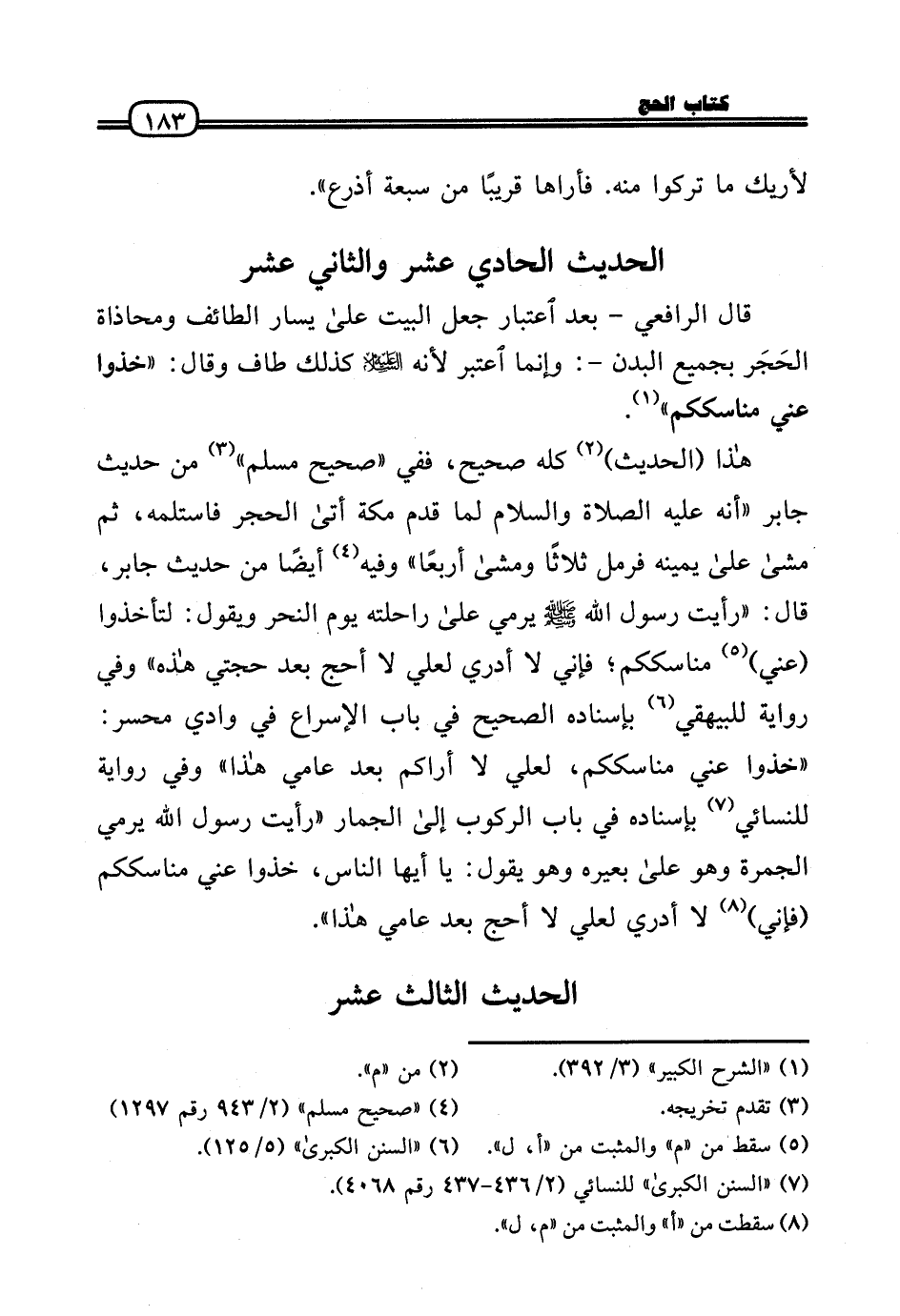 هَذَا (الحَدِيث) كُله صَحِيح، فَفِي «صَحِيح مُسلم» من حَدِيث جَابر «أَنه عَلَيْهِ الصَّلَاة وَالسَّلَامُ لما قدم مَكَّة أَتَى الْحجر فاستلمه، ثمَّ مَشَى عَلَى يَمِينه فَرمَلَ ثَلَاثًا وَمَشى أَرْبعا» وَفِيه أَيْضا من حَدِيث جَابر، قَالَ: «رَأَيْت رَسُول الله - صَلَّى الله عَلَيْهِ وَسلم - يَرْمِي عَلَى رَاحِلَته يَوْم النَّحْر وَيَقُول: لِتَأْخُذُوا (عني) مَنَاسِككُم؛ فَإِنِّي لَا أَدْرِي لعَلي لَا أحج بعد حجتي هَذِه» وَفِي رِوَايَة للبيهقي بِإِسْنَادِهِ الصَّحِيح فِي بَاب الْإِسْرَاع فِي وَادي محسر: «خُذُوا عني مَنَاسِككُم، لعَلي لَا أَرَاكُم بعد عَامي هَذَا» وَفِي رِوَايَة للنسائي بِإِسْنَادِهِ فِي بَاب الرّكُوب إِلَى الْجمار «رَأَيْت رَسُول الله يَرْمِي الْجَمْرَة وَهُوَ عَلَى بعيره وَهُوَ يَقُول: يَا أَيهَا النَّاس، خُذُوا عني مَنَاسِككُم (فَإِنِّي) لَا أَدْرِي لعَلي لَا أحج بعد عَامي هَذَا» .