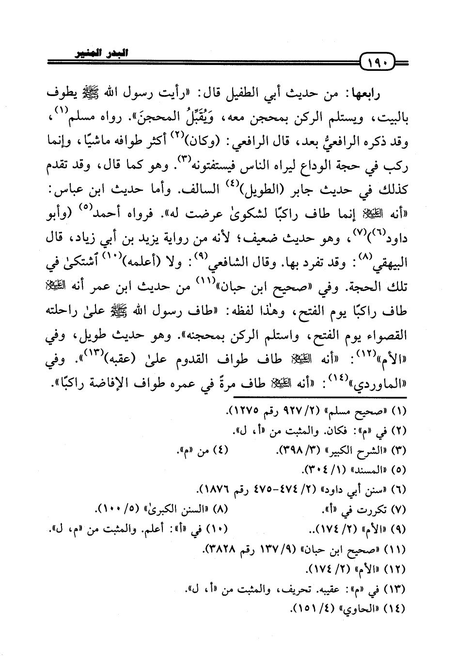 رَابِعهَا: من حَدِيث أبي الطُّفَيْل قَالَ: «رَأَيْت رَسُول الله - صَلَّى الله عَلَيْهِ وَسلم - يطوف بِالْبَيْتِ، ويستلم الرُّكْن بمحجن مَعَه، وَيُقَبِّلُ المحجنَ» . رَوَاهُ مُسلم، وَقد ذكره الرافعيُّ بعد، قَالَ الرَّافِعِيّ: (وَكَانَ) أَكثر طَوَافه مَاشِيا، وَإِنَّمَا ركب فِي حجَّة الْوَدَاع ليراه النَّاس فيستفتونه. وَهُوَ كَمَا قَالَ، وَقد تقدم كَذَلِك فِي حَدِيث جَابر (الطَّوِيل) السالف. وَأما حَدِيث ابْن عَبَّاس: «أَنه عَلَيْهِ السَّلَام إِنَّمَا طَاف رَاكِبًا لشكوى عرضت لَهُ» . فَرَوَاهُ أَحْمد (وَأَبُو دَاوُد) ، وَهُوَ حَدِيث ضَعِيف؛ لِأَنَّهُ من رِوَايَة يزِيد بن أبي زِيَاد، قَالَ الْبَيْهَقِيّ: وَقد تفرد بهَا. وَقَالَ الشَّافِعِي: وَلَا (أعلمهُ) اشْتَكَى فِي تِلْكَ الْحجَّة. وَفِي «صَحِيح ابْن حبَان» من حَدِيث ابْن عمر أَنه عَلَيْهِ السَّلَام طَاف رَاكِبًا يَوْم الْفَتْح، وَهَذَا لَفظه: «طَاف رَسُول الله - صَلَّى الله عَلَيْهِ وَسلم - عَلَى رَاحِلَته الْقَصْوَاء يَوْم الْفَتْح، واستلم الرُّكْن بِمِحْجَنِهِ» . وَهُوَ حَدِيث طَوِيل، وَفِي «الْأُم» : «أَنه عَلَيْهِ السَّلَام طَاف طواف الْقدوم عَلَى (عقبه) » . وَفِي «الْمَاوَرْدِيّ» : «أَنه عَلَيْهِ السَّلَام طَاف مرّة فِي عمره طواف الْإِفَاضَة رَاكِبًا» .