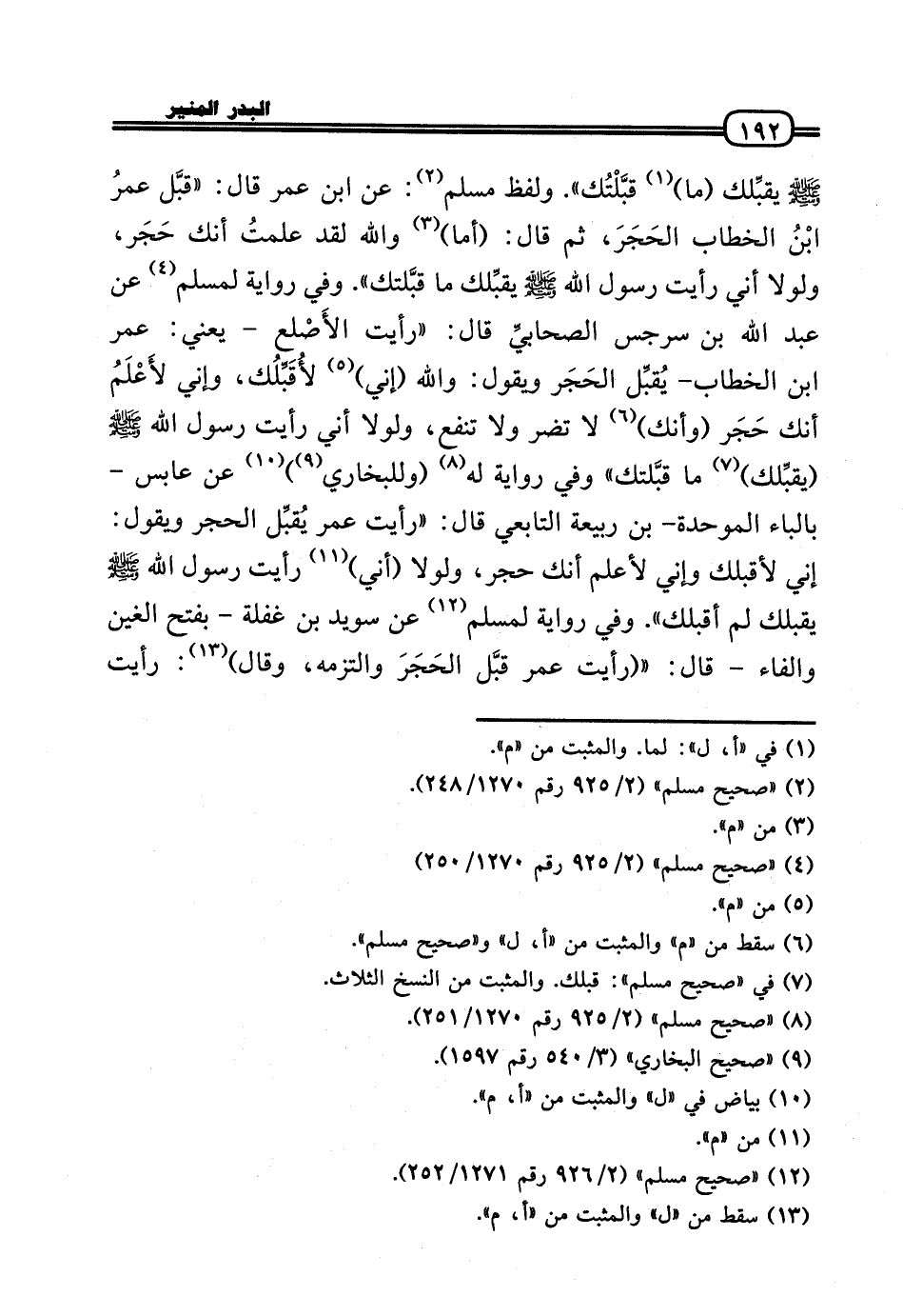 (يقبِّلك (مَا) قبَّلْتُك» . وَلَفظ مُسلم: عَن ابْن عمر قَالَ: «قبَّل عمرُ بْنُ الْخطاب الحَجَرَ، ثمَّ قَالَ: (أما) واللهِ لقد علمتُ أَنَّك حَجَر، وَلَوْلَا أَنِّي رَأَيْت رَسُول الله - صَلَّى الله عَلَيْهِ وَسلم - يقبِّلك مَا قبَّلتك» . وَفِي رِوَايَة لمُسلم عَن عبد الله بن سرجس الصحابيِّ قَالَ: «رَأَيْت الأَصْلع - يَعْنِي: عمر بن الْخطاب - يُقبِّل الحَجَر وَيَقُول: واللَّهِ (إِنِّي) لأُقَبِّلُك، وَإِنِّي لأَعْلَمُ أَنَّك حَجَر (وَأَنَّك) لَا تضر وَلَا تَنْفَع، وَلَوْلَا أَنِّي رَأَيْت رَسُول الله - صَلَّى الله عَلَيْهِ وَسلم - (يقبِّلك) مَا قبَّلتك» وَفِي رِوَايَة لَهُ (وللبخاري) عَن عَابس - بِالْبَاء الْمُوَحدَة - بن ربيعَة التَّابِعِيّ قَالَ: «رَأَيْت عمر يُقبِّل الْحجر وَيَقُول: إِنِّي لأقبلك وَإِنِّي لأعْلم أَنَّك حجر، وَلَوْلَا (أَنِّي) رَأَيْت رَسُول الله - صَلَّى الله عَلَيْهِ وَسلم - يقبلك لم أقبلك» . وَفِي رِوَايَة لمُسلم عَن سُوَيْد بن غَفلَة - بِفَتْح الْغَيْن وَالْفَاء - قَالَ: « (رَأَيْت عمر قبَّل الحَجَرَ وَالْتَزَمَهُ، وَقَالَ) : رَأَيْت
