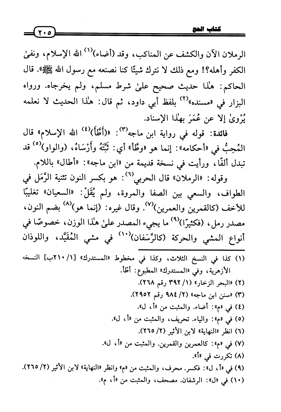 الرملان الْآن والكشف عَن المناكب، وَقد (أَضَاء) الله الْإِسْلَام، وَنَفَى الْكفْر وَأَهله؟ ! وَمَعَ ذَلِك لَا نَتْرُك شَيْئا كُنَّا نصنعه مَعَ رَسُول الله - صَلَّى الله عَلَيْهِ وَسلم -» . قَالَ الْحَاكِم: هَذَا حَدِيث صَحِيح عَلَى شَرط مُسلم، وَلم يخرجَاهُ. وَرَوَاهُ الْبَزَّار فِي «مُسْنده» بِلَفْظ أبي دَاوُد، ثمَّ قَالَ: هَذَا الحَدِيث لَا نعلمهُ يُرْوى إِلَّا عَن عُمَرَ بِهَذَا الْإِسْنَاد.