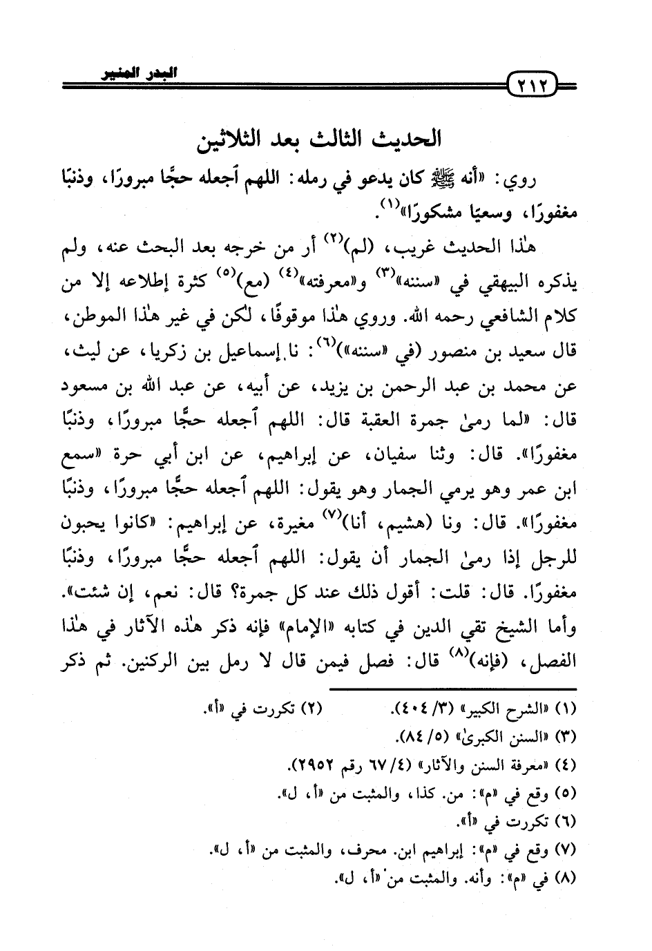 هَذَا الحَدِيث غَرِيب، (لم) أر من خرجه بعد الْبَحْث عَنهُ، وَلم يذكرهُ الْبَيْهَقِيّ فِي «سنَنه» و «مَعْرفَته» (مَعَ) كَثْرَة إطلاعه إِلَّا من كَلَام الشَّافِعِي رَحِمَهُ اللَّهُ. وَرُوِيَ هَذَا مَوْقُوفا، لَكِن فِي غير هَذَا الموطن، قَالَ سعيد بن مَنْصُور (فِي «سنَنه» ) : نَا إِسْمَاعِيل بن زَكَرِيَّا، عَن لَيْث، عَن مُحَمَّد بن عبد الرَّحْمَن بن يزِيد، عَن أَبِيه، عَن عبد الله بن مَسْعُود قَالَ: «لما رَمَى جَمْرَة الْعقبَة قَالَ: اللَّهُمَّ اجْعَلْهُ حجًّا مبرورًا، وذنبًا مغفورًا» . قَالَ: وثنا سُفْيَان، عَن إِبْرَاهِيم، عَن ابْن أبي حرَّة «سمع ابْن عمر وَهُوَ يَرْمِي الْجمار وَهُوَ يَقُول: اللَّهُمَّ اجْعَلْهُ حجًّا مبرورًا، وذنبًا مغفورًا» . قَالَ: ونا (هشيم، أَنا) مُغيرَة، عَن إِبْرَاهِيم: «كَانُوا يحبونَ للرجل إِذا رَمَى الْجمار أَن يَقُول: اللَّهُمَّ اجْعَلْهُ حجًّا مبرورًا، وذنبًا مغفورًا. قَالَ: قلت: أَقُول ذَلِك عِنْد كل جَمْرَة؟ قَالَ: نعم، إِن شِئْت» . وَأما الشَّيْخ تَقِيّ الدَّين فِي كِتَابه «الإِمَام» فَإِنَّهُ ذكر هَذِه الْآثَار فِي هَذَا الْفَصْل، (فَإِنَّهُ) قَالَ: فصل فِيمَن قَالَ لَا رمل بَين الرُّكْنَيْنِ. ثمَّ ذكر