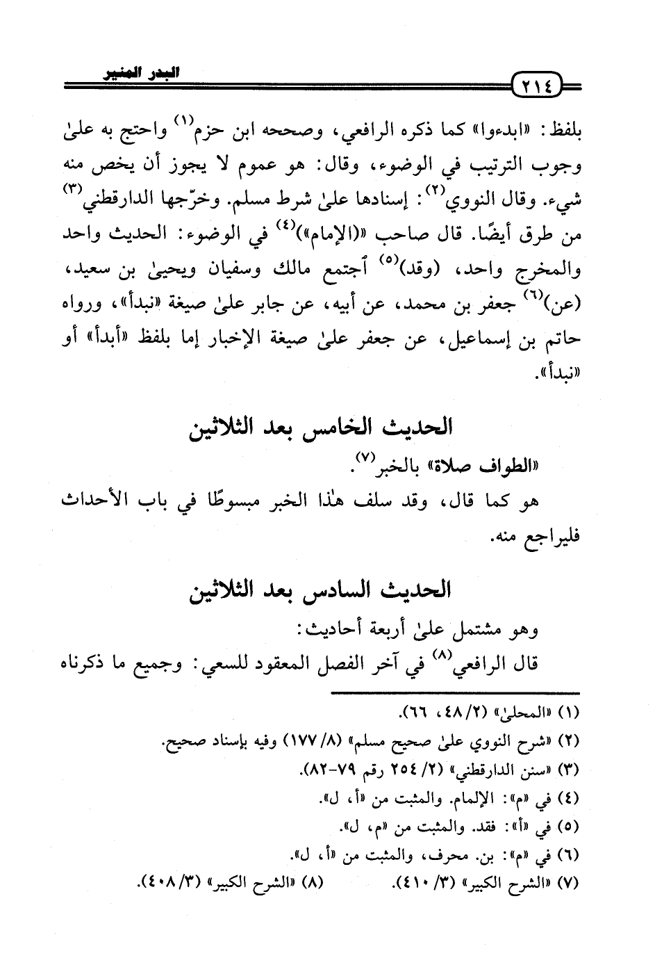 بِلَفْظ: «ابدءوا» كَمَا ذكره الرَّافِعِيّ، وَصَححهُ ابْن حزم وَاحْتج بِهِ عَلَى وجوب التَّرْتِيب فِي الْوضُوء، وَقَالَ: هُوَ عُمُوم لَا يجوز أَن يخص مِنْهُ شَيْء. وَقَالَ النَّوَوِيّ: إسنادها عَلَى شَرط مُسلم. وخرّجها الدَّارَقُطْنِيّ من طرق أَيْضا. قَالَ صَاحب « (الإِمَام» ) فِي الْوضُوء: الحَدِيث وَاحِد والمخرج وَاحِد، (وَقد) اجْتمع مَالك وسُفْيَان وَيَحْيَى بن سعيد، (عَن) جَعْفَر بن مُحَمَّد، عَن أَبِيه، عَن جَابر عَلَى صِيغَة «نبدأ» ، وَرَوَاهُ حَاتِم بن إِسْمَاعِيل، عَن جَعْفَر عَلَى صِيغَة الْإِخْبَار إِمَّا بِلَفْظ «أبدأ» أَو «نبدأ» .