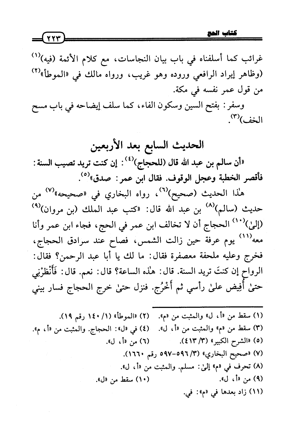 «أَن سَالم بن عبد الله قَالَ (للحجاج) : إِن كنت تُرِيدُ تصيب السّنة: فأقصر الْخطْبَة وَعجل الْوُقُوف. فَقَالَ ابْن عمر: صدق» .