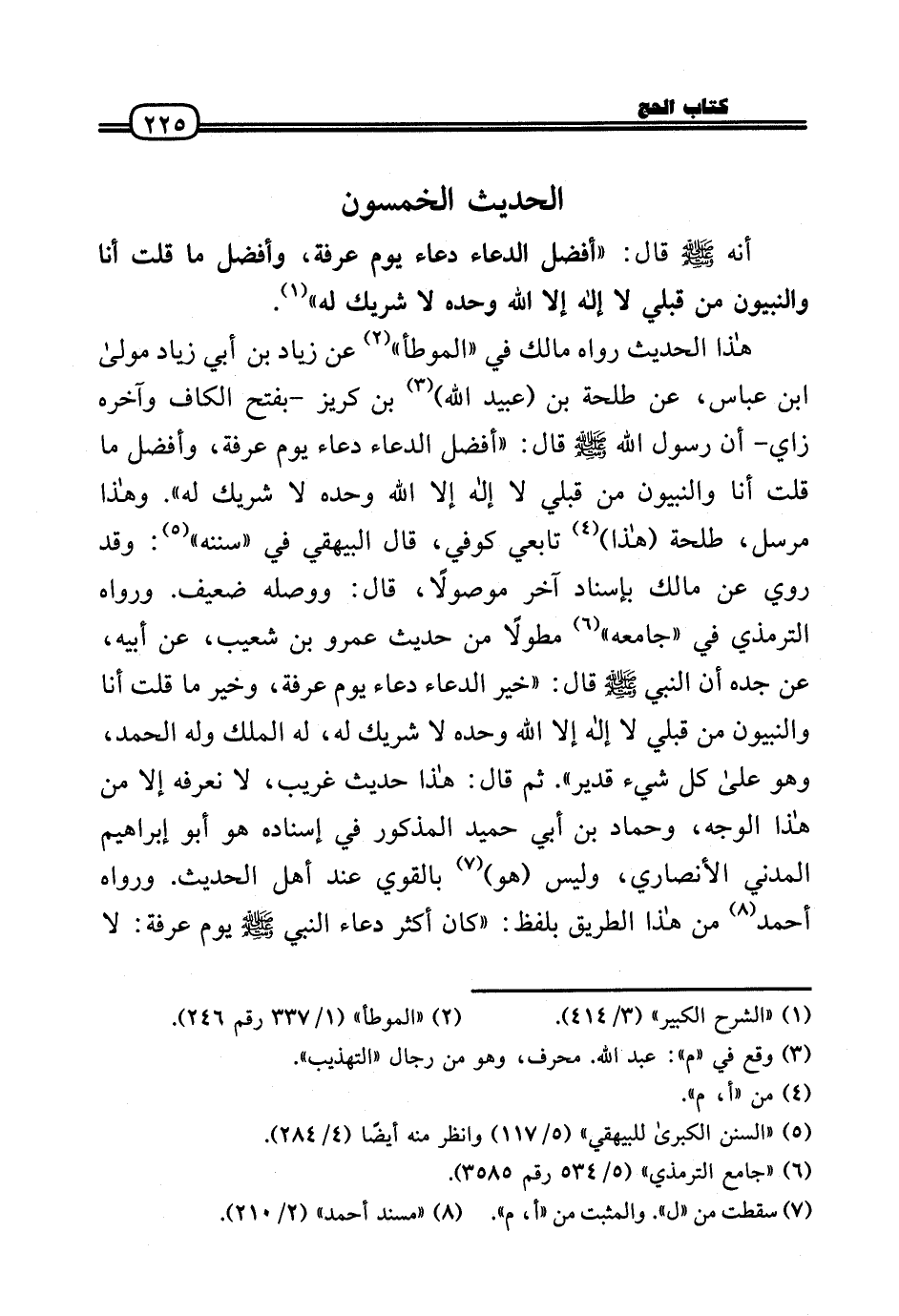 هَذَا الحَدِيث رَوَاهُ مَالك فِي «الْمُوَطَّأ» عَن زِيَاد بن أبي زِيَاد مولَى ابْن عَبَّاس، عَن طَلْحَة بن (عبيد الله) بن كريز - بِفَتْح الْكَاف وَآخره زَاي - أَن رَسُول الله - صَلَّى الله عَلَيْهِ وَسلم - قَالَ: «أفضل الدُّعَاء دُعَاء يَوْم عَرَفَة، وَأفضل مَا قلت أَنا والنبيون من قبلي لَا إِلَه إِلَّا الله وَحده لَا شريك لَهُ» . وَهَذَا مُرْسل، طَلْحَة (هَذَا) تَابِعِيّ كُوفِي، قَالَ الْبَيْهَقِيّ فِي «سنَنه» : وَقد رُوِيَ عَن مَالك بِإِسْنَاد آخر مَوْصُولا، قَالَ: وَوَصله ضَعِيف. وَرَوَاهُ التِّرْمِذِيّ فِي «جَامعه» مطولا من حَدِيث عَمْرو بن شُعَيْب، عَن أَبِيه، عَن جده أَن النَّبِي - صَلَّى الله عَلَيْهِ وَسلم - قَالَ: «خير الدُّعَاء دُعَاء يَوْم عَرَفَة، وَخير مَا قلت أَنا والنبيون من قبلي لَا إِلَه إِلَّا الله وَحده لَا شريك لَهُ، لَهُ الْملك وَله الْحَمد، وَهُوَ عَلَى كل شَيْء قدير» . ثمَّ قَالَ: هَذَا حَدِيث غَرِيب، لَا نعرفه إِلَّا من هَذَا الْوَجْه، وَحَمَّاد بن أبي حميد الْمَذْكُور فِي إِسْنَاده هُوَ أَبُو إِبْرَاهِيم الْمدنِي الْأنْصَارِيّ، وَلَيْسَ (هُوَ) بِالْقَوِيّ عِنْد أهل الحَدِيث. وَرَوَاهُ أَحْمد من هَذَا الطَّرِيق بِلَفْظ: «كَانَ أَكثر دُعَاء النَّبِي - صَلَّى الله عَلَيْهِ وَسلم - يَوْم عَرَفَة: لَا