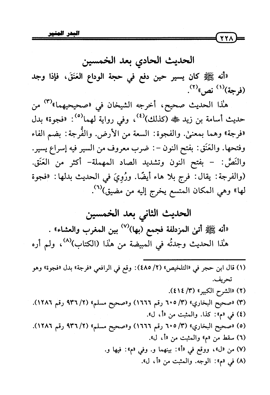 هَذَا الحَدِيث صَحِيح، أخرجه الشَّيْخَانِ فِي «صَحِيحَيْهِمَا» من حَدِيث أُسَامَة بن زيد رَضِيَ اللَّهُ عَنْه (كَذَلِك) ، وَفِي رِوَايَة لَهما: «فجوة» بدل «فُرْجَة» وهما بِمَعْنى. والفجوة: السعَة من الأَرْض. والفُّرجة: بِضَم الْفَاء وَفتحهَا. والعَنَق: بِفَتْح النُّون -: ضرب مَعْرُوف من السّير فِيهِ إسراع يسير. والنَصَّ: - بِفَتْح النُّون وَتَشْديد الصَّاد الْمُهْملَة - " أَكثر من العَنَق. (والفرجة: يُقَال: فرج بِلَا هَاء أَيْضا. ورُوِيَ فِي الحَدِيث بدلهَا: «فجوة لَهَا» وَهِي الْمَكَان المتسع يخرج إِلَيْهِ من مضيق) .