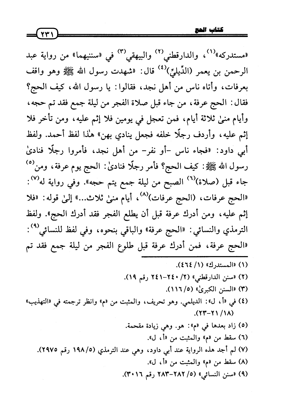 «مُسْتَدْركه» ، وَالدَّارَقُطْنِيّ وَالْبَيْهَقِيّ فِي «سنَنَيْهِمَا» من رِوَايَة عبد الرَّحْمَن بن يعمر (الدِّيليِّ) قَالَ: «شهِدت رَسُول الله - صَلَّى الله عَلَيْهِ وَسلم - وَهُوَ وَاقِف بِعَرَفَات، وَأَتَاهُ نَاس من أهل نجد، فَقَالُوا: يَا رَسُول الله، كَيفَ الْحَج؟ فَقَالَ: الْحَج عَرَفَة، من جَاءَ قبل صَلَاة الْفجْر من لَيْلَة جمع فقد تمّ حجه، وَأَيَّام منى ثَلَاثَة أَيَّام، فَمن تعجل فِي يَوْمَيْنِ فَلَا إِثْم عَلَيْهِ، وَمن تَأَخّر فَلَا إِثْم عَلَيْهِ، وَأَرْدَفَ رجلا خَلفه فَجعل يُنَادي بِهن» هَذَا لفظ أَحْمد. وَلَفظ أبي دَاوُد: «فجَاء نَاس - أَو نفر - من أهل نجد، فَأمروا رجلا فَنَادَى رَسُول الله - صَلَّى الله عَلَيْهِ وَسلم -: كَيفَ الْحَج؟ فَأمر رجلا فَنَادَى: الْحَج يَوْم عَرَفَة، وَمن جَاءَ قبل (صَلَاة) الصُّبْح من لَيْلَة جمع يتم حجه» . وَفِي رِوَايَة لَهُ: «الْحَج عَرَفَات، (الْحَج عَرَفَات) ، أَيَّام منى ثَلَاث ... » إِلَى قَوْله: «فَلَا إِثْم عَلَيْهِ، وَمن أدْرك عَرَفَة قبل أَن يطلع الْفجْر فقد أدْرك الْحَج» . وَلَفظ التِّرْمِذِيّ وَالنَّسَائِيّ: «الْحَج عَرَفَة» وَالْبَاقِي بِنَحْوِهِ، وَفِي لفظ للنسائي: «الْحَج عَرَفَة، فَمن أدْرك عَرَفَة قبل طُلُوع الْفجْر من لَيْلَة جمع فقد تمّ