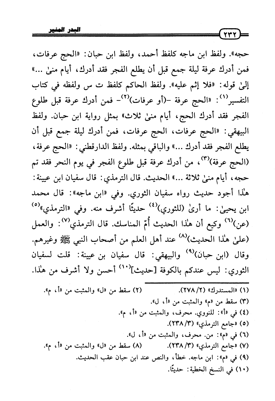 حجه» . وَلَفظ ابْن مَاجَه كَلَفْظِ أَحْمد، وَلَفظ ابْن حبَان: «الْحَج عَرَفَات، فَمن أدْرك عَرَفَة لَيْلَة جمع قبل أَن يطلع الْفجْر فقد أدْرك، أَيَّام منى ... » إِلَى قَوْله: «فَلَا إِثْم عَلَيْهِ» . وَلَفظ الْحَاكِم كَلَفْظِ ت س وَلَفظه فِي كتاب التَّفْسِير: «الْحَج عَرَفَة - (أَو عَرَفَات) - فَمن أدْرك عَرَفَة قبل طُلُوع الْفجْر فقد أدْرك الْحَج، أَيَّام منى ثَلَاث» بِمثل رِوَايَة ابْن حبَان. وَلَفظ الْبَيْهَقِيّ: «الْحَج عَرَفَات، الْحَج عَرَفَات، فَمن أدْرك لَيْلَة جمع قبل أَن يطلع الْفجْر فقد أدْرك ... » وَالْبَاقِي بِمثلِهِ. وَلَفظ الدَّارَقُطْنِيّ: «الْحَج عَرَفَة، (الْحَج عَرَفَة) ، من أدْرك عَرَفَة قبل طُلُوع الْفجْر فِي يَوْم النَّحْر فقد تمّ حجه، أَيَّام منى ثَلَاثَة ... » الحَدِيث. قَالَ التِّرْمِذِيّ: قَالَ سُفْيَان بن عُيَيْنَة: هَذَا أَجود حَدِيث رَوَاهُ سُفْيَان الثَّوْريّ. وَفِي «ابْن مَاجَه» : قَالَ مُحَمَّد بن يَحْيَى: مَا أرَى (للثوري) حَدِيثا أشرف مِنْهُ. وَفِي «التِّرْمِذِيّ» (عَن) وَكِيع أَن هَذَا الحَدِيث أُمّ الْمَنَاسِك. قَالَ التِّرْمِذِيّ: وَالْعَمَل (عَلَى هَذَا الحَدِيث) عِنْد أهل الْعلم من أَصْحَاب النَّبِي - صَلَّى الله عَلَيْهِ وَسلم - وَغَيرهم. وَقَالَ (ابْن حبَان) وَالْبَيْهَقِيّ: قَالَ سُفْيَان بن عُيَيْنَة: قلت لِسُفْيَان الثَّوْريّ: لَيْسَ عنْدكُمْ بِالْكُوفَةِ [حَدِيث] أحسن وَلَا أشرف من هَذَا.