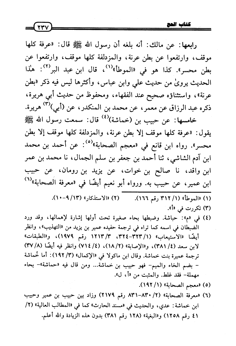 خَامِسهَا: عَن حبيب بن (خماشة) قَالَ: سَمِعت رَسُول الله - صَلَّى الله عَلَيْهِ وَسلم - يَقُول: «عَرَفَة كلهَا موقف إِلَّا بطن عُرَنَة، والمزدلفة كلهَا موقف إِلَّا بطن محسر» . رَوَاهُ ابْن قَانِع فِي «مُعْجم الصَّحَابَة» : عَن أَحْمد بن مُحَمَّد بن آدم الشَّاشِي، ثَنَا أَحْمد بن جَعْفَر بن سلم الْجمال، نَا مُحَمَّد بن عمر بن وَاقد، نَا صَالح بن خَوات، عَن يزِيد بن رُومَان، عَن حبيب بن عُمَيْر، عَن حبيب بِهِ. وَرَوَاهُ أَبُو نعيم أَيْضا فِي «معرفَة الصَّحَابَة»