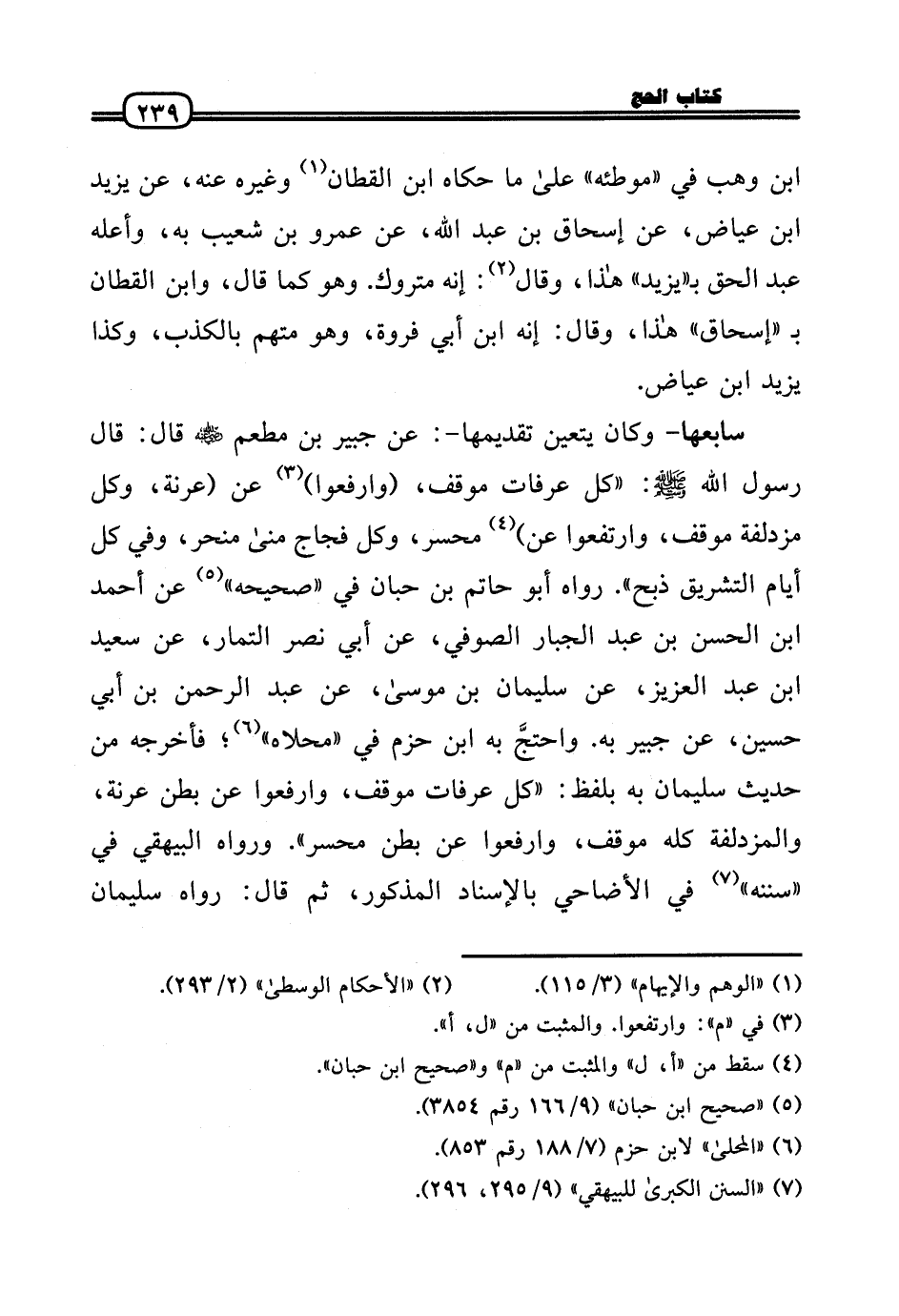 سابعها - وَكَانَ يتَعَيَّن تَقْدِيمهَا -: عَن جُبَير بن مطعم رَضِيَ اللَّهُ عَنْه قَالَ: قَالَ رَسُول الله - صَلَّى الله عَلَيْهِ وَسلم -: «كل عَرَفَات موقف، (وَارْفَعُوا) عَن (عُرَنَة، وكل مُزْدَلِفَة موقف، وارتفعوا عَن) محسر، وكل فجاج منى منحر، وَفِي كل أَيَّام التَّشْرِيق ذبح» . رَوَاهُ أَبُو حَاتِم بن حبَان فِي «صَحِيحه» عَن أَحْمد بن الْحسن بن عبد الْجَبَّار الصُّوفِي، عَن أبي نصر التمار، عَن سعيد بن عبد الْعَزِيز، عَن سُلَيْمَان بن مُوسَى، عَن عبد الرَّحْمَن بن أبي حُسَيْن، عَن جُبَير بِهِ. واحتجَّ بِهِ ابْن حزم فِي «محلاه» ؛ فَأخْرجهُ من حَدِيث سُلَيْمَان بِهِ بِلَفْظ: «كل عَرَفَات موقف، وَارْفَعُوا عَن بطن عُرَنَة، والمزدلفة كُله موقف، وَارْفَعُوا عَن بطن محسر» . وَرَوَاهُ الْبَيْهَقِيّ فِي «سنَنه» فِي الْأَضَاحِي بِالْإِسْنَادِ الْمَذْكُور، ثمَّ قَالَ: رَوَاهُ سُلَيْمَان