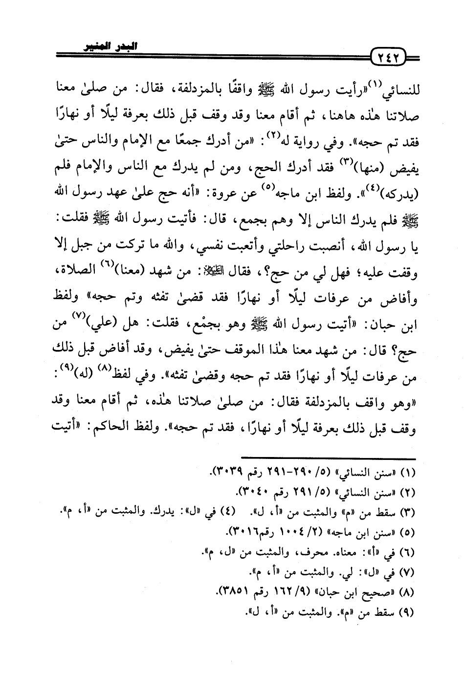 للنسائي «رَأَيْت رَسُول الله - صَلَّى الله عَلَيْهِ وَسلم - وَاقِفًا بِالْمُزْدَلِفَةِ، فَقَالَ: من صَلَّى مَعنا صَلَاتنَا هَذِه هَاهُنَا، ثمَّ أَقَامَ مَعنا وَقد وقف قبل ذَلِك بِعَرَفَة لَيْلًا أَو نَهَارا فقد تمّ حجه» . وَفِي رِوَايَة لَهُ: «من أدْرك جمعا مَعَ الإِمَام وَالنَّاس حَتَّى يفِيض (مِنْهَا) فقد أدْرك الْحَج، وَمن لم يدْرك مَعَ النَّاس وَالْإِمَام فَلم (يُدْرِكهُ) » . وَلَفظ ابْن مَاجَه عَن عُرْوَة: «أَنه حج عَلَى عهد رَسُول الله - صَلَّى الله عَلَيْهِ وَسلم - فَلم يدْرك النَّاس إِلَّا وهم بِجمع، قَالَ: فَأتيت رَسُول الله - صَلَّى الله عَلَيْهِ وَسلم - فَقلت: يَا رَسُول الله، أنصبت رَاحِلَتي وأتعبت نَفسِي، وَالله مَا تركت من جبل إِلَّا وقفت عَلَيْهِ؛ فَهَل لي من حج؟ ، فَقَالَ عَلَيْهِ السَّلَام: من شهد (مَعنا) الصَّلَاة، وأفاض من عَرَفَات لَيْلًا أَو نَهَارا فقد قَضَى تفثه وَتمّ حجه» وَلَفظ ابْن حبَان: «أتيت رَسُول الله - صَلَّى الله عَلَيْهِ وَسلم - وَهُوَ بجمْع، فَقلت: هَل (عَلّي) من حج؟ قَالَ: من شهد مَعنا هَذَا الْموقف حَتَّى يفِيض، وَقد أَفَاضَ قبل ذَلِك من عَرَفَات لَيْلًا أَو نَهَارا فقد تمّ حجه وَقَضَى تفثه» . وَفِي لفظ (لَهُ) : «وَهُوَ وَاقِف بِالْمُزْدَلِفَةِ فَقَالَ: من صَلَّى صَلَاتنَا هَذِه، ثمَّ أَقَامَ مَعنا وَقد وقف قبل ذَلِك بِعَرَفَة لَيْلًا أَو نَهَارا، فقد تمّ حجه» . وَلَفظ الْحَاكِم: «أتيت