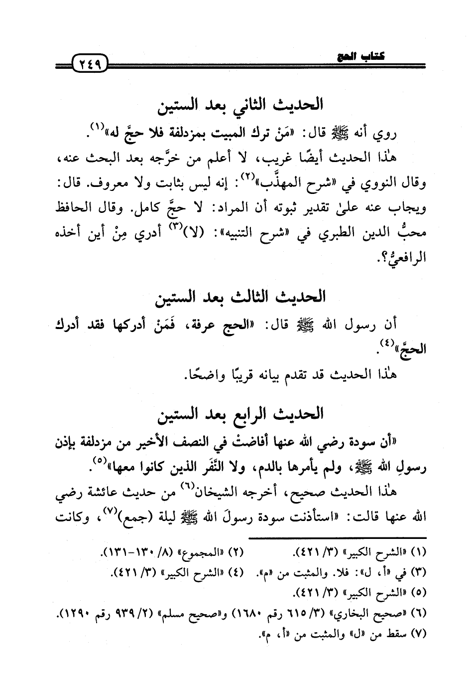 «أَن سَوْدَة رَضِيَ اللَّهُ عَنْها أفاضتْ فِي النّصْف الْأَخير من مُزْدَلِفَة بِإِذن رَسُول الله - صَلَّى الله عَلَيْهِ وَسلم -، وَلم يأمرها بِالدَّمِ، وَلَا النَّفَر الَّذين كَانُوا مَعهَا» .