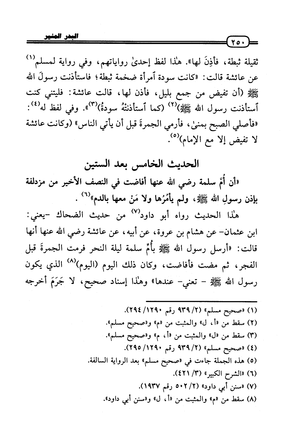 «أَن أُمَّ سَلمَة رَضِيَ اللَّهُ عَنْها أفاضت فِي النّصْف الْأَخير من مُزْدَلِفَة بِإِذن رَسُول الله - صَلَّى الله عَلَيْهِ وَسلم -، وَلم يأمُرُها وَلَا مَنْ مَعهَا بِالدَّمِ» .