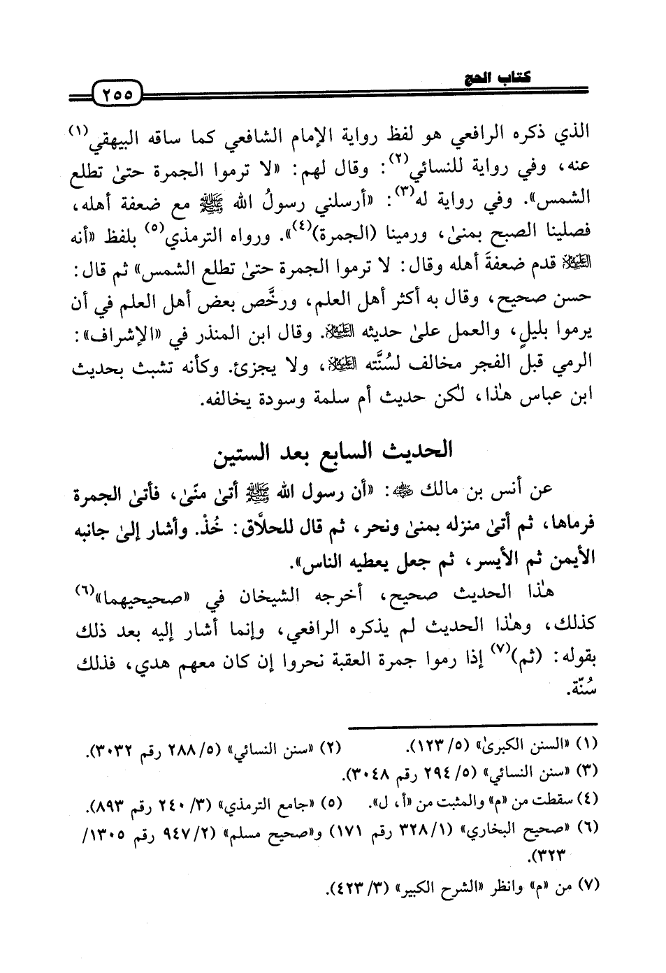 الَّذِي ذكره الرَّافِعِيّ هُوَ لفظ رِوَايَة الإِمَام الشَّافِعِي كَمَا سَاقه الْبَيْهَقِيّ عَنهُ، وَفِي رِوَايَة للنسائي: وَقَالَ لَهُم: «لَا ترموا الْجَمْرَة حَتَّى تطلع الشَّمْس» . وَفِي رِوَايَة لَهُ: «أَرْسلنِي رَسُول الله - صَلَّى الله عَلَيْهِ وَسلم - مَعَ ضعفة أَهله، فصلينا الصُّبْح بمنى، ورمينا (الْجَمْرَة) » . وَرَوَاهُ التِّرْمِذِيّ بِلَفْظ «أَنه عَلَيْهِ السَّلَام قدم ضعفةَ أَهله وَقَالَ: لَا ترموا الْجَمْرَة حَتَّى تطلع الشَّمْس» ثمَّ قَالَ: حسن صَحِيح، وَقَالَ بِهِ أَكثر أهل الْعلم، ورخَّص بعض أهل الْعلم فِي أَن يرموا بليلٍ، وَالْعَمَل عَلَى حَدِيثه عَلَيْهِ السَّلَام. وَقَالَ ابْن الْمُنْذر فِي «الإشراف» : الرَّمْي قبل الْفجْر مُخَالف لسُنَّته عَلَيْهِ السَّلَام، وَلَا يُجزئ. وَكَأَنَّهُ تشبث بِحَدِيث ابْن عَبَّاس هَذَا، لَكِن حَدِيث أم سَلمَة وَسَوْدَة يُخَالِفهُ.