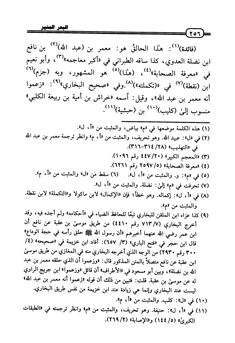 (فَائِدَة) : هَذَا الحالقُ هُوَ: معمر بن (عبد الله) بن نَافِع بن نَضْلَة الْعَدوي، كَذَا سَاقه الطَّبَرَانِيّ فِي «أكبر معاجمه» ، وَأَبُو نعيم فِي «معرفَة الصَّحَابَة» ، (هَذَا) هُوَ الْمَشْهُور، وَبِه (جزم) ابْنُ (نقطة) فِي « (تكملته» ) . وَفِي «صَحِيح البُخَارِيّ» : «زَعَمُوا أَنه معمر بن عبد الله» ، وَقيل: اسْمه «خرَاش بن أُميَّة بن ربيعَة الْكَلْبِيّ» مَنْسُوب إِلَى (كُلَيْب) بن (حبشية) .