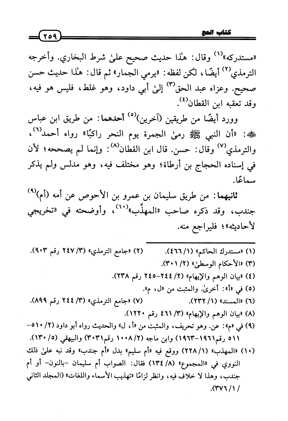 «مُسْتَدْركه» وَقَالَ: هَذَا حَدِيث صَحِيح عَلَى شَرط البُخَارِيّ. وَأخرجه التِّرْمِذِيّ أَيْضا، لَكِن لَفظه: «يَرْمِي الْجمار» ثمَّ قَالَ: هَذَا حَدِيث حسن صَحِيح. وَعَزاهُ عبد الْحق إِلَى أبي دَاوُد، وَهُوَ غلط، فَلَيْسَ هُوَ فِيهِ، وَقد تعقبه ابْن الْقطَّان.