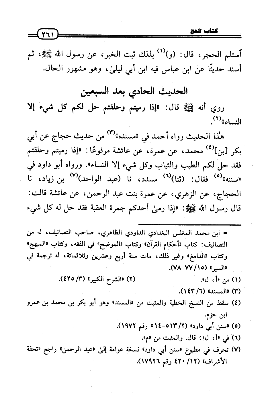 هَذَا الحَدِيث رَوَاهُ أَحْمد فِي «مُسْنده» من حَدِيث حجاج عَن أبي بكر [بن] مُحَمَّد، عَن عمْرَة، عَن عَائِشَة مَرْفُوعا: «إِذا رميتم وحلقتم فقد حل لكم الطّيب وَالثيَاب وكل شَيْء إِلَّا النِّسَاء» . وَرَوَاهُ أَبُو دَاوُد فِي «سنَنه» فَقَالَ: (ثَنَا) مُسَدّد، نَا (عبد الْوَاحِد) بن زِيَاد، نَا الْحجَّاج، عَن الزُّهْرِيّ، عَن عمْرَة بنت عبد الرَّحْمَن، عَن عَائِشَة قَالَت: قَالَ رَسُول الله - صَلَّى الله عَلَيْهِ وَسلم -: «إِذا رَمَى أحدكُم جَمْرَة الْعقبَة فقد حل لَهُ كل شَيْء