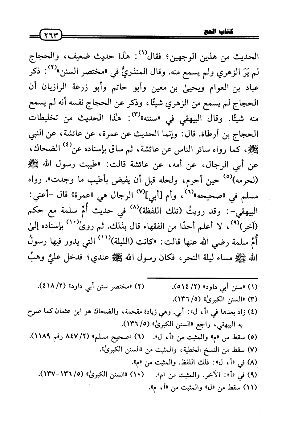 الحَدِيث من هذَيْن الْوَجْهَيْنِ؛ فَقَالَ: هَذَا حَدِيث ضَعِيف، وَالْحجاج لم يَرَ الزُّهْرِيّ وَلم يسمع مِنْهُ. وَقَالَ المنذريُّ فِي «مُخْتَصر السّنَن» : ذكر عباد بن الْعَوام وَيَحْيَى بن معِين وَأَبُو حَاتِم وَأَبُو زرْعَة الرازيان أَن الْحجَّاج لم يسمع من الزُّهْرِيّ شَيْئا، وَذكر عَن الْحجَّاج نَفسه أَنه لم يسمع مِنْهُ شَيْئا. وَقَالَ الْبَيْهَقِيّ فِي «سنَنه» : هَذَا الحَدِيث من تخليطات الْحجَّاج بن أَرْطَاة. قَالَ: وَإِنَّمَا الحَدِيث عَن عمْرَة، عَن عَائِشَة، عَن النَّبِي - صَلَّى الله عَلَيْهِ وَسلم -، كَمَا رَوَاهُ سَائِر النَّاس عَن عَائِشَة، ثمَّ سَاق بِإِسْنَادِهِ عَن الضَّحَّاك، عَن أبي الرِّجَال، عَن أمه، عَن عَائِشَة قَالَت: «طيبت رَسُول الله - صَلَّى الله عَلَيْهِ وَسلم - (لحرمه) حِين أحرم، ولحله قبل أَن يفِيض بأطيب مَا وجدت» . رَوَاهُ مُسلم فِي «صَحِيحه» ، وَأم [أبي] الرِّجَال هِيَ «عمْرَة» قَالَ - أَعنِي: الْبَيْهَقِيّ -: وَقد رويتُ (تِلْكَ اللَّفْظَة) فِي حَدِيث أُمِّ سَلمَة مَعَ حكم (آخر) ، لَا أعلم أحدا من الْفُقَهَاء قَالَ بذلك. ثمَّ رَوَى بِإِسْنَادِهِ إِلَى أُمِّ سَلمَة رَضِيَ اللَّهُ عَنْها قَالَت: «كَانَت (اللَّيْلَة) الَّتِي يَدُور فِيهَا رَسُول الله - صَلَّى الله عَلَيْهِ وَسلم - مسَاء لَيْلَة النَّحْر، فَكَانَ رَسُول الله - صَلَّى الله عَلَيْهِ وَسلم - عِنْدِي؛ فَدخل عليَّ وهبُ