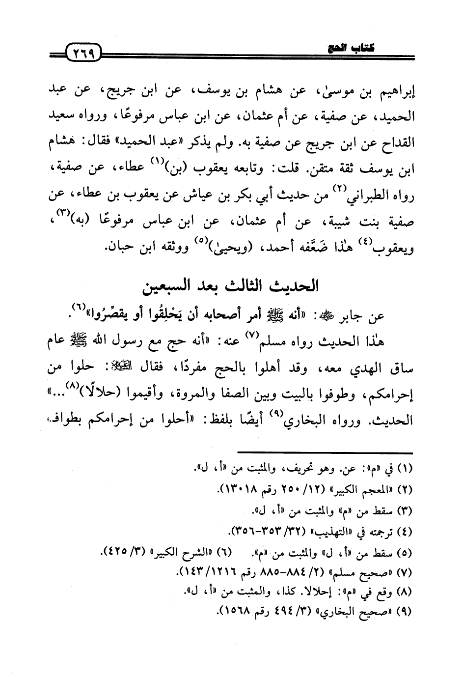 إِبْرَاهِيم بن مُوسَى، عَن هِشَام بن يُوسُف، عَن ابْن جريج، عَن عبد الحميد، عَن صَفِيَّة، عَن أم عُثْمَان، عَن ابْن عَبَّاس مَرْفُوعا، وَرَوَاهُ سعيد القداح عَن ابْن جريج عَن صَفِيَّة بِهِ. وَلم يذكر «عبد الحميد» فَقَالَ: هِشَام بن يُوسُف ثِقَة متقن. قلت: وَتَابعه يَعْقُوب (بن) عَطاء، عَن صَفِيَّة، رَوَاهُ الطَّبَرَانِيّ من حَدِيث أبي بكر بن عَيَّاش عَن يَعْقُوب بن عَطاء، عَن صَفِيَّة بنت شيبَة، عَن أم عُثْمَان، عَن ابْن عَبَّاس مَرْفُوعا (بِهِ) ، وَيَعْقُوب هَذَا ضَعَّفه أَحْمد، (وَيَحْيَى) وَوَثَّقَهُ ابْن حبَان.