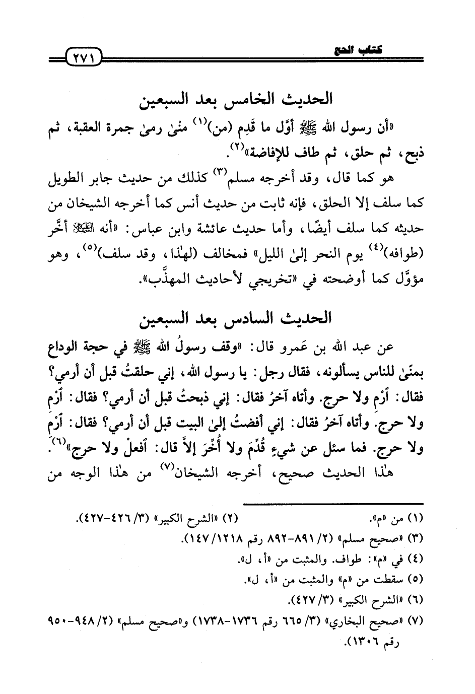 عَن عبد الله بن عَمرو قَالَ: «وقف رَسُول الله - صَلَّى الله عَلَيْهِ وَسلم - فِي حجَّة الْوَدَاع بمنى للنَّاس يسألونه، فَقَالَ رجل: يَا رَسُول الله، إِنِّي حلقتُ قبل أَن أرمي؟ فَقَالَ: ارْمِ وَلَا حرج. وَأَتَاهُ آخرُ فَقَالَ: إِنِّي ذبحتُ قبل أَن أرمي؟ فَقَالَ: ارْمِ وَلَا حرج. وَأَتَاهُ آخرُ فَقَالَ: إِنِّي أفضتُ إِلَى الْبَيْت قبل أَن أرمي؟ فَقَالَ: ارْمِ وَلَا حرج. فَمَا سُئِلَ عَن شيءٍ قُدِّمَ وَلَا أُخِّرَ إلاَّ قَالَ: افعلْ وَلَا حرج» .