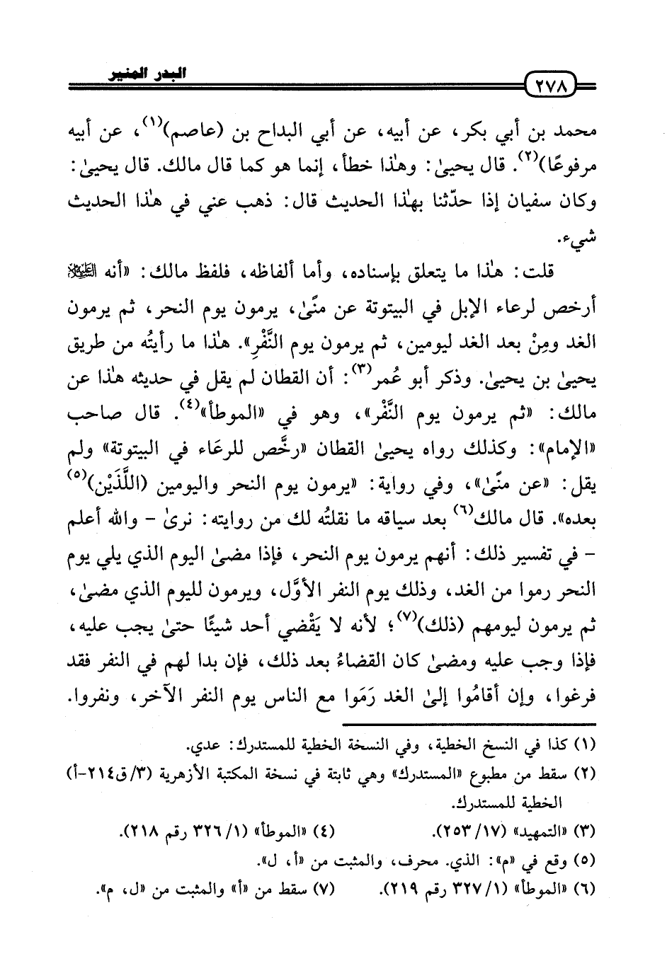 قلت: هَذَا مَا يتَعَلَّق بِإِسْنَادِهِ، وَأما أَلْفَاظه، فَلفظ مَالك: «أَنه عَلَيْهِ السَّلَام أرخص لرعاء الْإِبِل فِي البيتوتة عَن منى، يرْمونَ يَوْم النَّحْر، ثمَّ يرْمونَ الْغَد ومِنْ بعد الْغَد ليومين، ثمَّ يرْمونَ يَوْم النَّفْرِ» . هَذَا مَا رأيتُه من طَرِيق يَحْيَى بن يَحْيَى. وَذكر أَبُو عُمر: أَن الْقطَّان لم يقل فِي حَدِيثه هَذَا عَن مَالك: «ثمَّ يرْمونَ يَوْم النَّفْر» ، وَهُوَ فِي «الْمُوَطَّأ» . قَالَ صَاحب «الإِمَام» : وَكَذَلِكَ رَوَاهُ يَحْيَى الْقطَّان «رخَّص للرعَاء فِي البيتوتة» وَلم يقل: «عَن منى» ، وَفِي رِوَايَة: «يرْمونَ يَوْم النَّحْر واليومين (اللَّذَيْن) بعده» . قَالَ مَالك بعد سِيَاقه مَا نقلتُه لَك من رِوَايَته: نرَى - واللَّهُ أعلم - فِي تَفْسِير ذَلِك: أَنهم يرْمونَ يَوْم النَّحْر، فَإِذا مَضَى الْيَوْم الَّذِي يَلِي يَوْم النَّحْر رموا من الْغَد، وَذَلِكَ يَوْم النَّفر الأوَّل، ويرمون لليوم الَّذِي مَضَى، ثمَّ يرْمونَ ليومهم (ذَلِك) ؛ لِأَنَّهُ لَا يَقْضي أحد شَيْئا حَتَّى يجب عَلَيْهِ، فَإِذا وَجب عَلَيْهِ وَمَضَى كَانَ القضاءُ بعد ذَلِك، فَإِن بدا لَهُم فِي النَّفر فقد فرغوا، وَإِن أقامُوا إِلَى الْغَد رَمَوا مَعَ النَّاس يَوْم النَّفر الآخر، ونفروا.