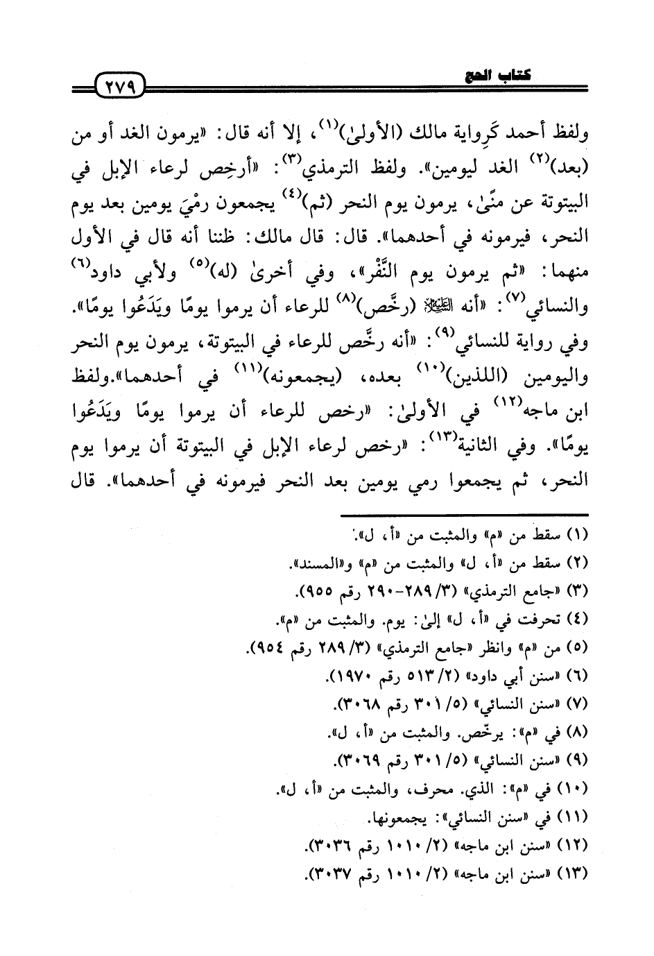 وَلَفظ أَحْمد كَرِواية مَالك (الأولَى) ، إِلَّا أَنه قَالَ: «يرْمونَ الْغَد أَو من (بعد) الْغَد ليومين» . وَلَفظ التِّرْمِذِيّ: «أرخِص لرعاء الْإِبِل فِي البيتوتة عَن منى، يرْمونَ يَوْم النَّحْر (ثمَّ) يجمعُونَ رمْيَ يَوْمَيْنِ بعد يَوْم النَّحْر، فيرمونه فِي أَحدهمَا» . قَالَ: قَالَ مَالك: ظننا أَنه قَالَ فِي الأول مِنْهُمَا: «ثمَّ يرْمونَ يَوْم النَّفْر» ، وَفِي أُخْرَى (لَهُ) وَلأبي دَاوُد وَالنَّسَائِيّ: «أَنه عَلَيْهِ السَّلَام (رخَّص) للرعاء أَن يرموا يَوْمًا ويَدَعُوا يَوْمًا» . وَفِي رِوَايَة للنسائي: «أَنه رخَّص للرعاء فِي البيتوتة، يرْمونَ يَوْم النَّحْر واليومين (اللَّذين) بعده، (يجمعونه) فِي أَحدهمَا» . وَلَفظ ابْن مَاجَه فِي الأولَى: «رخص للرعاء أَن يرموا يَوْمًا ويَدَعُوا يَوْمًا» . وَفِي الثَّانِيَة: «رخص لرعاء الْإِبِل فِي البيتوتة أَن يرموا يَوْم النَّحْر، ثمَّ يجمعوا رمي يَوْمَيْنِ بعد النَّحْر فيرمونه فِي أَحدهمَا» . قَالَ