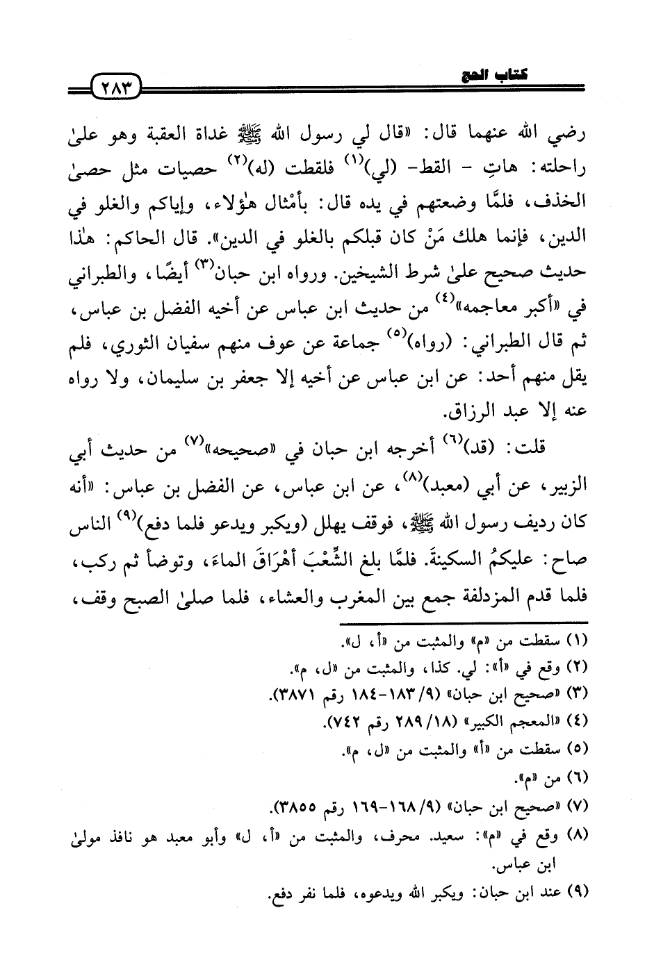 رَضِيَ اللَّهُ عَنْهما قَالَ: «قَالَ لي رَسُول الله - صَلَّى الله عَلَيْهِ وَسلم - غَدَاة الْعقبَة وَهُوَ عَلَى رَاحِلَته: هاتِ - القط - (لي) فلقطت (لَهُ) حَصَيَات مثل حَصى الْخذف، فلمَّا وضعتهم فِي يَده قَالَ: بأمْثال هَؤُلَاءِ، وَإِيَّاكُم والغلو فِي الدَّين، فَإِنَّمَا هلك مَنْ كَانَ قبلكُمْ بالغلو فِي الدَّين» . قَالَ الْحَاكِم: هَذَا حَدِيث صَحِيح عَلَى شَرط الشَّيْخَيْنِ. وَرَوَاهُ ابْن حبَان أَيْضا، وَالطَّبَرَانِيّ فِي «أكبر معاجمه» من حَدِيث ابْن عَبَّاس عَن أَخِيه الْفضل بن عَبَّاس، ثمَّ قَالَ الطَّبَرَانِيّ: (رَوَاهُ) جمَاعَة عَن عَوْف مِنْهُم سُفْيَان الثَّوْريّ، فَلم يقل مِنْهُم أحد: عَن ابْن عَبَّاس عَن أَخِيه إِلَّا جَعْفَر بن سُلَيْمَان، وَلَا رَوَاهُ عَنهُ إِلَّا عبد الرَّزَّاق.