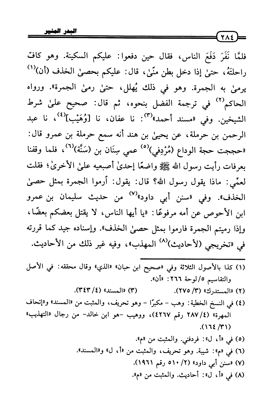 فلمَّا نَفَرَ دَفَعَ النَّاس، فَقَالَ حِين دفعُوا: عَلَيْكُم السكينَة. وَهُوَ كافّ راحلتَهُ، حَتَّى إِذا دخل بطن منى، قَالَ: عَلَيْكُم بحصى الْخذف (أَن) يُرْمَى بِهِ الْجَمْرَة. وَهُوَ فِي ذَلِك يُهلل، حَتَّى رَمَى الْجَمْرَة» . وَرَوَاهُ الْحَاكِم فِي تَرْجَمَة الْفضل بِنَحْوِهِ، ثمَّ قَالَ: صَحِيح عَلَى شَرط الشَّيْخَيْنِ. وَفِي «مُسْند أَحْمد» : نَا عَفَّان، نَا [وُهَيْب] ، نَا عبد الرَّحْمَن بن حَرْمَلَة، عَن يَحْيَى بن هِنْد أَنه سمع حَرْمَلَة بن عَمْرو قَالَ: «حججْت حجَّة الْوَدَاع (مُرْدِفي) عمي سِنَان بن (سَنَّة) ، فَلَمَّا وقفنا بِعَرَفَات رَأَيْت رَسُول الله - صَلَّى الله عَلَيْهِ وَسلم - وَاضِعا إِحْدَى أصبعيه عَلَى الْأُخْرَى؛ فَقلت لعمِّي: مَاذَا يَقُول رَسُول الله؟ قَالَ: يَقُول: ارموا الْجَمْرَة بِمثل حَصى الْخذف» . وَفِي «سنَن أبي دَاوُد» من حَدِيث سُلَيْمَان بن عَمْرو بن الْأَحْوَص عَن أمه مَرْفُوعا: «يَا أَيهَا النَّاس، لَا يقتل بَعْضكُم بَعْضًا، وَإِذا رميتم الْجَمْرَة فارموا بِمثل حَصى الْخذف» . وَإِسْنَاده جيد كَمَا قَرّرته فِي «تخريجي (لأحاديث) الْمُهَذّب» ، وَفِيه غير ذَلِك من الْأَحَادِيث.