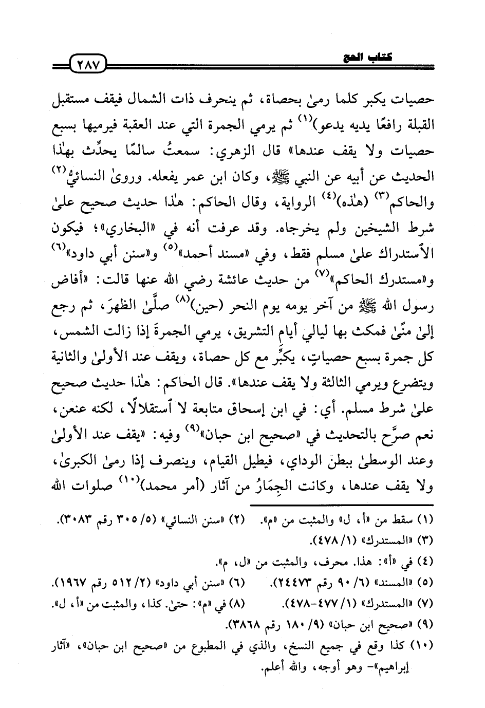 حَصَيَات يكبر كلما رَمَى بحصاة، ثمَّ ينحرف ذَات الشمَال فيقف مُسْتَقْبل الْقبْلَة رَافعا يَدَيْهِ يَدْعُو) ثمَّ يَرْمِي الْجَمْرَة الَّتِي عِنْد الْعقبَة فيرميها بِسبع حَصَيَات وَلَا يقف عِنْدهَا» قَالَ الزُّهْرِيّ: سمعتُ سالما يحدِّث بِهَذَا الحَدِيث عَن أَبِيه عَن النَّبِي - صَلَّى الله عَلَيْهِ وَسلم -، وَكَانَ ابْن عمر يَفْعَله. وَرَوَى النسائيُّ وَالْحَاكِم (هَذِه) الرِّوَايَة، وَقَالَ الْحَاكِم: هَذَا حَدِيث صَحِيح عَلَى شَرط الشَّيْخَيْنِ وَلم يخرجَاهُ. وَقد عرفت أَنه فِي «البُخَارِيّ» ؛ فَيكون الِاسْتِدْرَاك عَلَى مُسلم فَقَط، وَفِي «مُسْند أَحْمد» و «سنَن أبي دَاوُد» و «مُسْتَدْرك الْحَاكِم» من حَدِيث عَائِشَة رَضِيَ اللَّهُ عَنْها قَالَت: «أَفَاضَ رَسُول الله - صَلَّى الله عَلَيْهِ وَسلم - من آخر يَوْمه يَوْم النَّحْر (حِين) صلَّى الظهرَ، ثمَّ رَجَعَ إِلَى منى فَمَكثَ بهَا ليَالِي أيامِ التَّشْرِيق، يَرْمِي الجمرةَ إِذا زَالَت الشَّمْس، كل جَمْرَة بِسبع حصياتٍ، يكبِّر مَعَ كل حَصَاة، وَيقف عِنْد الأولَى وَالثَّانيَِة ويتضرع وَيَرْمِي الثَّالِثَة وَلَا يقف عِنْدهَا» . قَالَ الْحَاكِم: هَذَا حَدِيث صَحِيح عَلَى شَرط مُسلم. أَي: فِي ابْن إِسْحَاق مُتَابعَة لَا اسْتِقْلَالا، لكنه عنعن، نعم صرَّح بِالتَّحْدِيثِ فِي «صَحِيح ابْن حبَان» وَفِيه: «يقف عِنْد الأولَى وَعند الْوُسْطَى بِبَطن الوداي، فيطيل الْقيام، وينصرف إِذا رَمَى الْكُبْرَى، وَلَا يقف عِنْدهَا، وَكَانَت الجِمَارُ من آثَار (أَمر مُحَمَّد) صلوَات الله