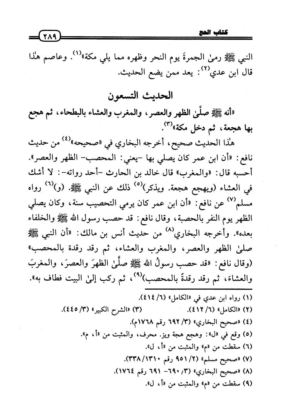 هَذَا الحَدِيث صَحِيح، أخرجه البُخَارِيّ فِي «صَحِيحه» من حَدِيث نَافِع: «أَن ابْن عمر كَانَ يُصَلِّي بهَا - يَعْنِي: المحصب - الظّهْر وَالْعصر» . أَحْسبهُ قَالَ: «وَالْمغْرب» قَالَ خَالِد بن الْحَارِث - أحد رُوَاته -: لَا أَشك فِي الْعشَاء (ويهجع هجعة. وَيذكر) ذَلِك عَن النَّبِي - صَلَّى الله عَلَيْهِ وَسلم -. (و) رَوَاهُ مُسلم عَن نَافِع: «أَن ابْن عمر كَانَ يَرْمِي التحصيب سنة، وَكَانَ يُصَلِّي الظّهْر يَوْم النَّفر بالحصبة، وَقَالَ نَافِع: قد حصب رَسُول الله - صَلَّى الله عَلَيْهِ وَسلم - وَالْخُلَفَاء بعده» . وَأخرجه البُخَارِيّ من حَدِيث أنس بن مَالك: «أَن النَّبِي - صَلَّى الله عَلَيْهِ وَسلم - صَلَّى الظّهْر وَالْعصر، وَالْمغْرب وَالْعشَاء، ثمَّ رقد رقدة بالمحصب» (وَقَالَ نَافِع: «قد حصب رَسُول الله - صَلَّى الله عَلَيْهِ وَسلم - صلَّى الظهرَ والعصرَ، والمغربَ والعشاءَ، ثمَّ رقد رقدةً بالمحصب) ، ثمَّ ركب إِلَى الْبَيْت فَطَافَ بِهِ» .
