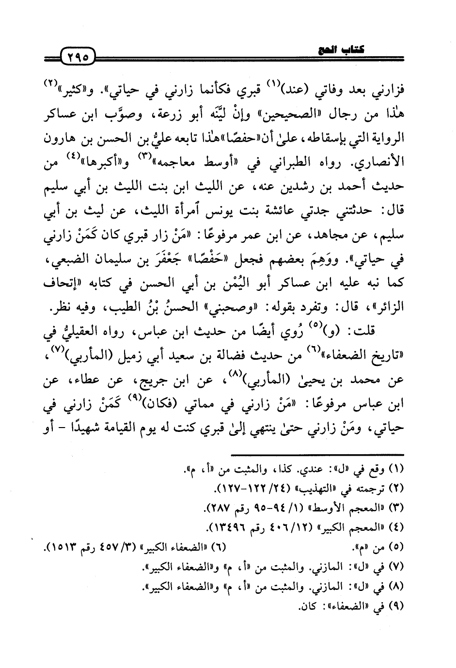 فزارني بعد وفاتي (عِنْد) قَبْرِي فَكَأَنَّمَا زارني فِي حَياتِي» . و «كثير» هَذَا من رجال «الصَّحِيحَيْنِ» وإنْ ليَّنَه أَبُو زرْعَة، وصوَّب ابنُ عَسَاكِر الرِّوَايَة الَّتِي بإسقاطه، عَلَى أَن «حفصًا» هَذَا تَابعه عليُّ بن الْحسن بن هَارُون الْأنْصَارِيّ. رَوَاهُ الطَّبَرَانِيّ فِي «أَوسط معاجمه» و «أكبرها» من حَدِيث أَحْمد بن رشدين عَنهُ، عَن اللَّيْث ابْن بنت اللَّيْث بن أبي سليم قَالَ: حَدَّثتنِي جدتي عَائِشَة بنت يُونُس امْرَأَة اللَّيْث، عَن لَيْث بن أبي سليم، عَن مُجَاهِد، عَن ابْن عمر مَرْفُوعا: «مَنْ زار قَبْرِي كَانَ كَمَنْ زارني فِي حَياتِي» . ووَهِمَ بَعضهم فَجعل «حَفْصًا» جَعْفَرَ بن سُلَيْمَان الضبعِي، كَمَا نبه عَلَيْهِ ابْنُ عَسَاكِر أَبُو اليُمْن بن أبي الْحسن فِي كِتَابه «إتحاف الزائر» ، قَالَ: وَتفرد بقوله: «وصحبني» الحسنُ بْنُ الطّيب، وَفِيه نظر.