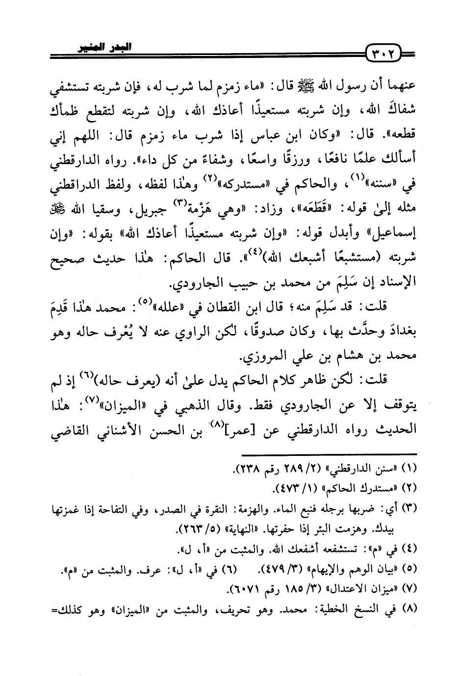 عَنْهُمَا أَن رَسُول الله - صَلَّى الله عَلَيْهِ وَسلم - قَالَ: «مَاء زَمْزَم لما شرب لَهُ، فَإِن شربته تستشفي شفاكَ الله، وَإِن شربته مستعيذًا أَعَاذَك الله، وَإِن شربته لتقطع ظمأك قطعه» . قَالَ: (وَكَانَ ابْن عَبَّاس إِذا شرب مَاء زَمْزَم قَالَ: اللَّهُمَّ إِنِّي أَسأَلك علما نَافِعًا، وَرِزْقًا وَاسِعًا، وشفاءً من كل دَاء» . رَوَاهُ الدَّارَقُطْنِيّ فِي «سنَنه» ، وَالْحَاكِم فِي «مُسْتَدْركه» وَهَذَا لَفظه، وَلَفظ الدارقطني مثله إِلَى قَوْله: «قَطَعَه» ، وَزَاد: «وَهِي هَزْمة جِبْرِيل، وسقيا الله عَزَّ وَجَلَّ إِسْمَاعِيل» وأبدل قَوْله: «وَإِن شربته مستعيذًا أَعَاذَك الله» بقوله: «وَإِن شربته (مستشبعًا أشبعك الله) » . قَالَ الْحَاكِم: هَذَا حَدِيث صَحِيح الْإِسْنَاد إِن سَلِمَ من مُحَمَّد بن حبيب الجارودي.