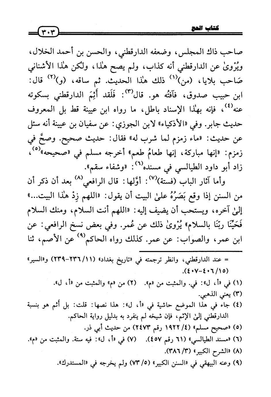 وَأما آثَار الْبَاب (فستة) : أوَّلها: قَالَ الرَّافِعِيّ بعد أَن ذكر أَن من السّنَن إِذا وَقع بَصَرُهُ عَلَى الْبَيْت أَن يَقُول: «اللَّهُمَّ زِدْ هَذَا الْبَيْت ... » إِلَى آخِره، وَيسْتَحب أَن يضيف إِلَيْهِ: «اللَّهُمَّ أَنْت السَّلَام، ومنك السَّلَام فَحَيِّنَا ربّنَا بِالسَّلَامِ» يُرْوى ذَلِك عَن عُمر. وَفِي بعض نسخ الرَّافِعِيّ: عَن ابْن عمر، وَالصَّوَاب: عَن عمر. كَذَلِك رَوَاهُ الْحَاكِم عَن الْأَصَم، ثَنَا
