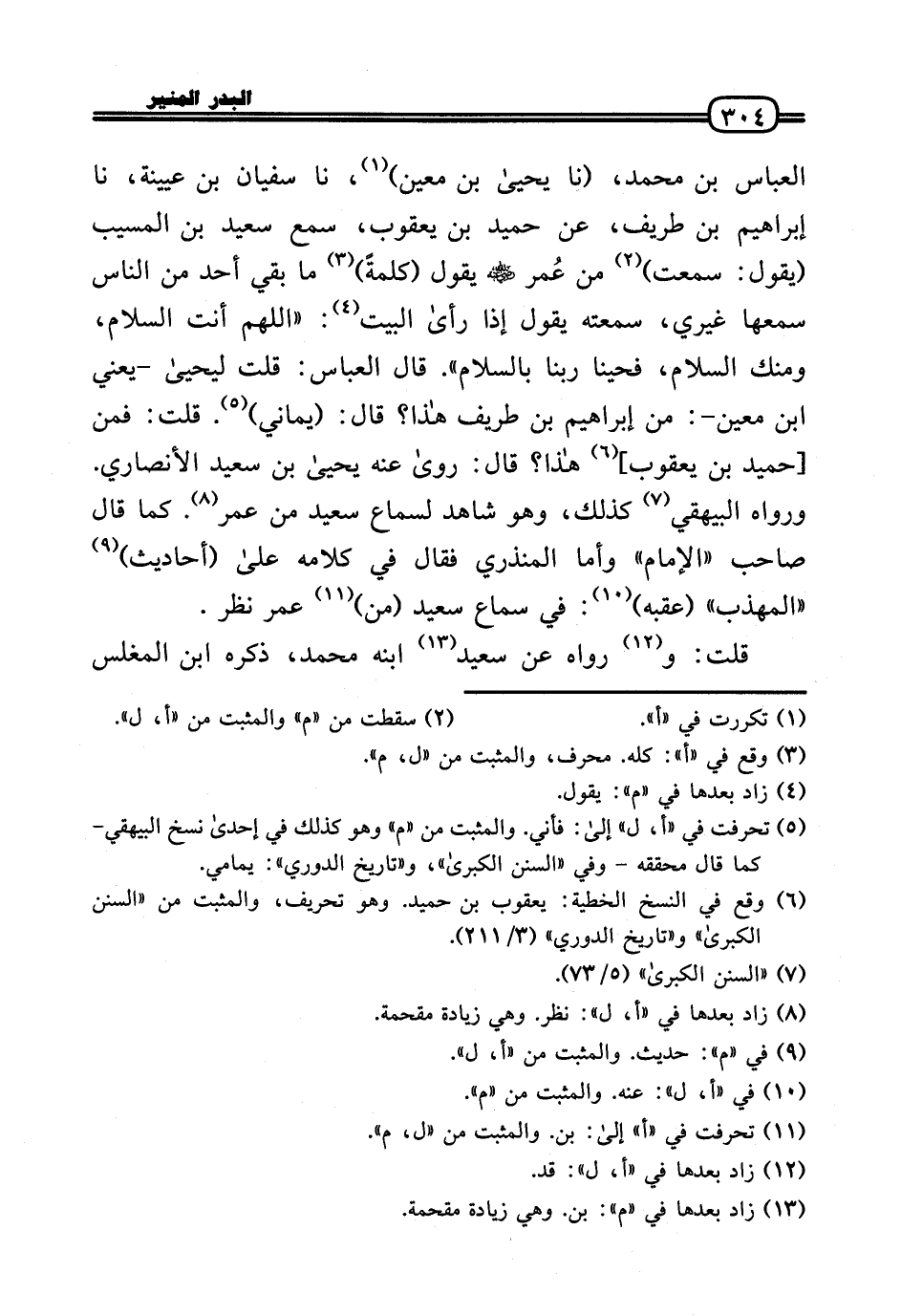 الْعَبَّاس بن مُحَمَّد، (نَا يَحْيَى بن معِين) ، نَا سُفْيَان بن عُيَيْنَة، نَا إِبْرَاهِيم بن طريف، عَن حميد بن يَعْقُوب، سمع سعيد بن الْمسيب (يَقُول: سَمِعت) من عُمر رَضِيَ اللَّهُ عَنْه يَقُول (كلمة) مَا بَقِي أحد من النَّاس سَمعهَا غَيْرِي، سمعته يَقُول إِذا رَأَى الْبَيْت: «اللَّهُمَّ أَنْت السَّلَام، ومنك السَّلَام، فحينا رَبنَا بِالسَّلَامِ» . قَالَ الْعَبَّاس: قلت ليحيى - يَعْنِي ابْن معِين -: من إِبْرَاهِيم بن طريف هَذَا؟ قَالَ: (يماني) . قلت: فَمن [حميد بن يَعْقُوب] هَذَا؟ قَالَ: رَوَى عَنهُ يَحْيَى بن سعيد الْأنْصَارِيّ. وَرَوَاهُ الْبَيْهَقِيّ كَذَلِك، وَهُوَ شَاهد لسَمَاع سعيد من عمر. كَمَا قَالَ صَاحب «الإِمَام» وَأما الْمُنْذِرِيّ فَقَالَ فِي كَلَامه عَلَى (أَحَادِيث) «الْمُهَذّب» (عقبه) : فِي سَماع سعيد (من) عمر نظر.