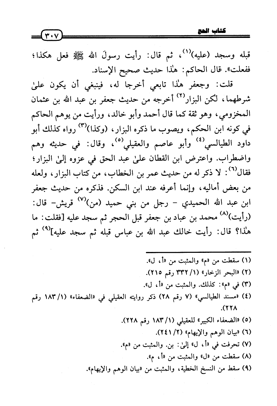 قلت: وجعفر هَذَا تَابِعِيّ أخرجَا لَهُ، فَيَنْبَغِي أَن يكون عَلَى شَرطهمَا، لَكِن الْبَزَّار أخرجه من حَدِيث جَعْفَر بن عبد الله بن عُثْمَان المَخْزُومِي، وَهُوَ ثِقَة كَمَا قَالَ أَحْمد وَأَبُو خَالِد، وَرَأَيْت من يُوهم الْحَاكِم فِي كَونه ابْن الحكم، ويصوب مَا ذكره الْبَزَّار، (وَكَذَا) رَوَاهُ كَذَلِك أَبُو دَاوُد الطَّيَالِسِيّ وَأَبُو عَاصِم والعقيلي، وَقَالَ: فِي حَدِيثه وهم واضطراب. وَاعْترض ابْن الْقطَّان عَلَى عبد الْحق فِي عزوه إِلَى الْبَزَّار؛ فَقَالَ: لَا ذكر لَهُ من حَدِيث عمر بن الْخطاب، من كتاب الْبَزَّار، وَلَعَلَّه من بعض أَمَالِيهِ، وَإِنَّمَا أعرفهُ عِنْد ابْن السكن. فَذكره من حَدِيث جَعْفَر بن عبد الله الْحميدِي - رجل من بني حميد (من) قُرَيْش - قَالَ: (رَأَيْت) مُحَمَّد بن عباد بن جَعْفَر قبل الْحجر ثمَّ سجد عَلَيْهِ [فَقلت: مَا هَذَا؟ قَالَ: رَأَيْت خَالك عبد الله بن عَبَّاس قبله ثمَّ سجد عَلَيْهِ] ثمَّ