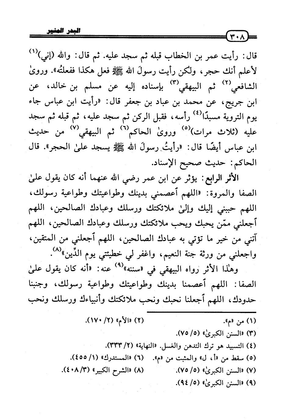 قَالَ: رَأَيْت عمر بن الْخطاب قبله ثمَّ سجد عَلَيْهِ. ثمَّ قَالَ: واللَّهِ (إِنِّي) لأعْلم أَنَّك حجر، وَلَكِن رَأَيْت رَسُول الله - صَلَّى الله عَلَيْهِ وَسلم - فعل هَكَذَا ففعلتُه» . وَرَوَى الشَّافِعِي ثمَّ الْبَيْهَقِيّ بِإِسْنَادِهِ إِلَيْهِ عَن مُسلم بن خَالِد، عَن ابْن جريج، عَن مُحَمَّد بن عباد بن جَعْفَر قَالَ: «رَأَيْت ابْن عَبَّاس جَاءَ يَوْم التَّرويَة مسبدًا رَأسه، فَقبل الرُّكْن ثمَّ سجد عَلَيْهِ، ثمَّ قبله ثمَّ سجد عَلَيْهِ (ثَلَاث مَرَّات) وَرَوَى الْحَاكِم ثمَّ الْبَيْهَقِيّ من حَدِيث ابْن عَبَّاس أَيْضا قَالَ: «رأيتُ رَسُول الله - صَلَّى الله عَلَيْهِ وَسلم - يسْجد عَلَى الْحجر» . قَالَ الْحَاكِم: حَدِيث صَحِيح الْإِسْنَاد.