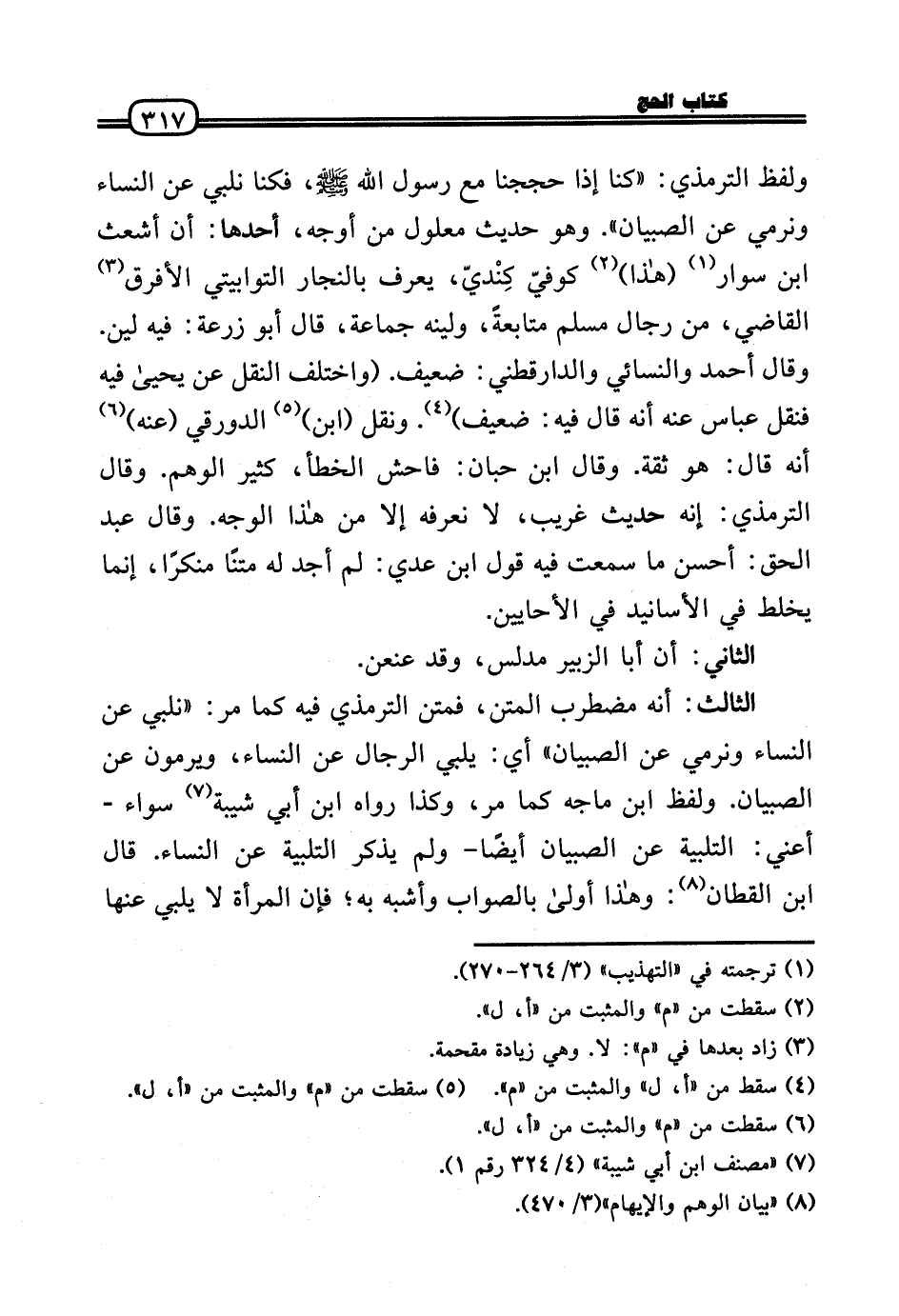 وَلَفظ التِّرْمِذِيّ: «كُنَّا إِذا حجَجنَا مَعَ رَسُول الله - صَلَّى الله عَلَيْهِ وَسلم -، فَكُنَّا نلبي عَن النِّسَاء ونرمي عَن الصّبيان» . وَهُوَ حَدِيث مَعْلُول من أوجه، أَحدهَا: أَن أَشْعَث بن سوار (هَذَا) كوفيّ كِنْديّ، يعرف بالنجار التوابيتي الأفرق القَاضِي، من رجال مُسلم مُتَابعَة، وَلينه جمَاعَة، قَالَ أَبُو زرْعَة: فِيهِ لين. وَقَالَ أَحْمد وَالنَّسَائِيّ وَالدَّارَقُطْنِيّ: ضَعِيف. (وَاخْتلف النَّقْل عَن يَحْيَى فِيهِ فَنقل عَبَّاس عَنهُ أَنه قَالَ فِيهِ: ضَعِيف) . وَنقل (ابْن) الدَّوْرَقِي (عَنهُ) أَنه قَالَ: هُوَ ثِقَة. وَقَالَ ابْن حبَان: فَاحش الْخَطَأ، كثير الْوَهم. وَقَالَ التِّرْمِذِيّ: إِنَّه حَدِيث غَرِيب، لَا نعرفه إِلَّا من هَذَا الْوَجْه. وَقَالَ عبد الْحق: أحسن مَا سَمِعت فِيهِ قَول ابْن عدي: لم أجد لَهُ متْنا مُنْكرا، إِنَّمَا يخلط فِي الْأَسَانِيد فِي الْأَحَايِين.