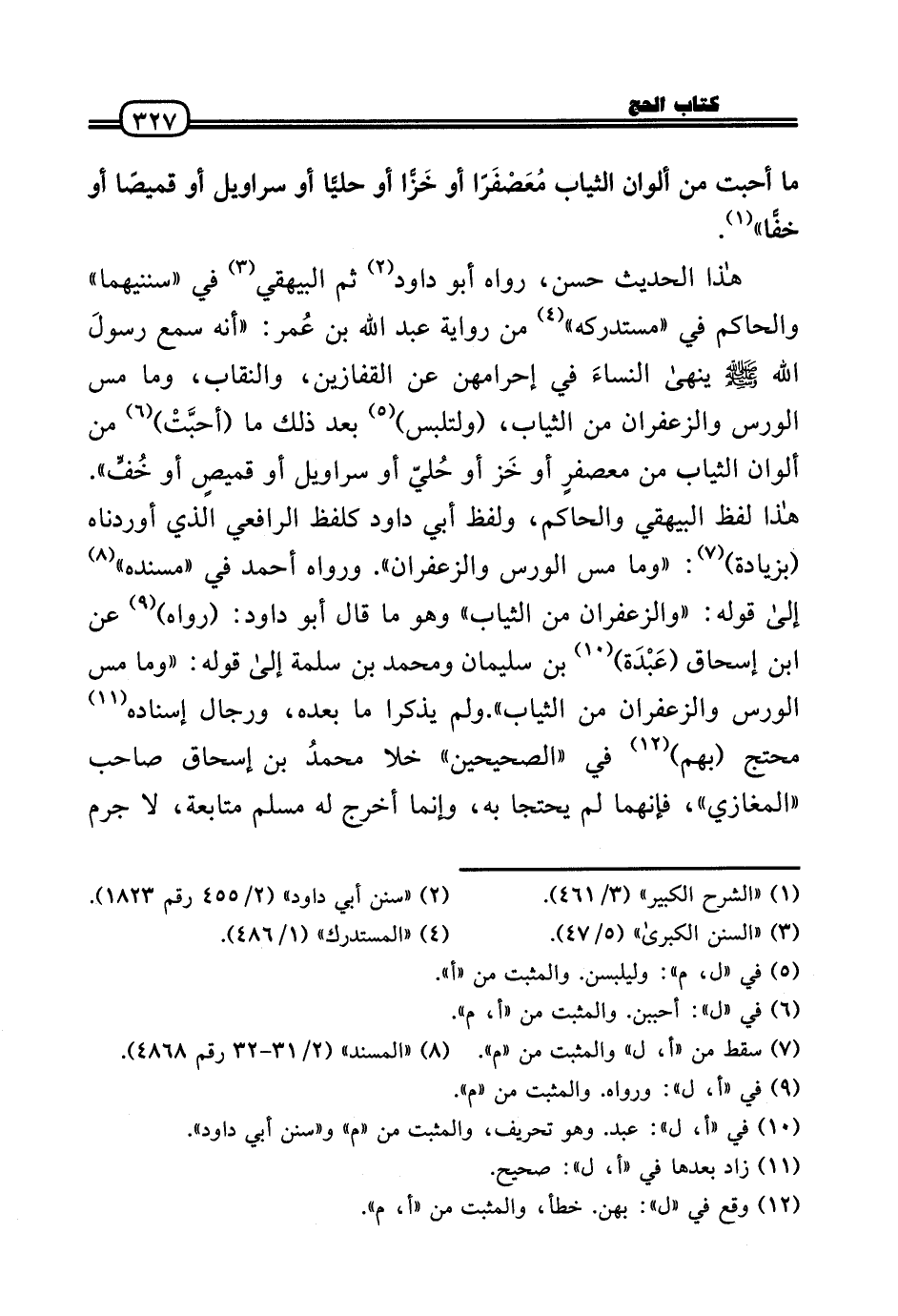 هَذَا الحَدِيث حسن، رَوَاهُ أَبُو دَاوُد ثمَّ الْبَيْهَقِيّ فِي «سنَنَيْهِمَا» وَالْحَاكِم فِي «مُسْتَدْركه» من رِوَايَة عبد الله بن عُمر: «أَنه سمع رَسُول الله - صَلَّى الله عَلَيْهِ وَسلم - ينْهَى النساءَ فِي إحرامهن عَن القفازين، والنقاب، وَمَا مس الورس والزعفران من الثِّيَاب، (ولتلبس) بعد ذَلِك مَا (أحبَّتْ) من ألوان الثِّيَاب من معصفرٍ أَو خَز أَو حُليّ أَو سَرَاوِيل أَو قميصٍ أَو خُفٍّ» . هَذَا لفظ الْبَيْهَقِيّ وَالْحَاكِم، وَلَفظ أبي دَاوُد كَلَفْظِ الرَّافِعِيّ الَّذِي أوردناه (بِزِيَادَة) : «وَمَا مس الورس والزعفران» . وَرَوَاهُ أَحْمد فِي «مُسْنده» إِلَى قَوْله: «والزعفران من الثِّيَاب» وَهُوَ مَا قَالَ أَبُو دَاوُد: (رَوَاهُ) عَن ابْن إِسْحَاق (عَبْدَة) بن سُلَيْمَان وَمُحَمّد بن سَلمَة إِلَى قَوْله: «وَمَا مس الورس والزعفران من الثِّيَاب» . وَلم يذكرَا مَا بعده، وَرِجَال إِسْنَاده مُحْتَج (بهم) فِي «الصَّحِيحَيْنِ» خلا محمدُ بن إِسْحَاق صَاحب «الْمَغَازِي» ، فَإِنَّهُمَا لم يحْتَجَّا بِهِ، وَإِنَّمَا أخرج لَهُ مُسلم مُتَابعَة، لَا جرم