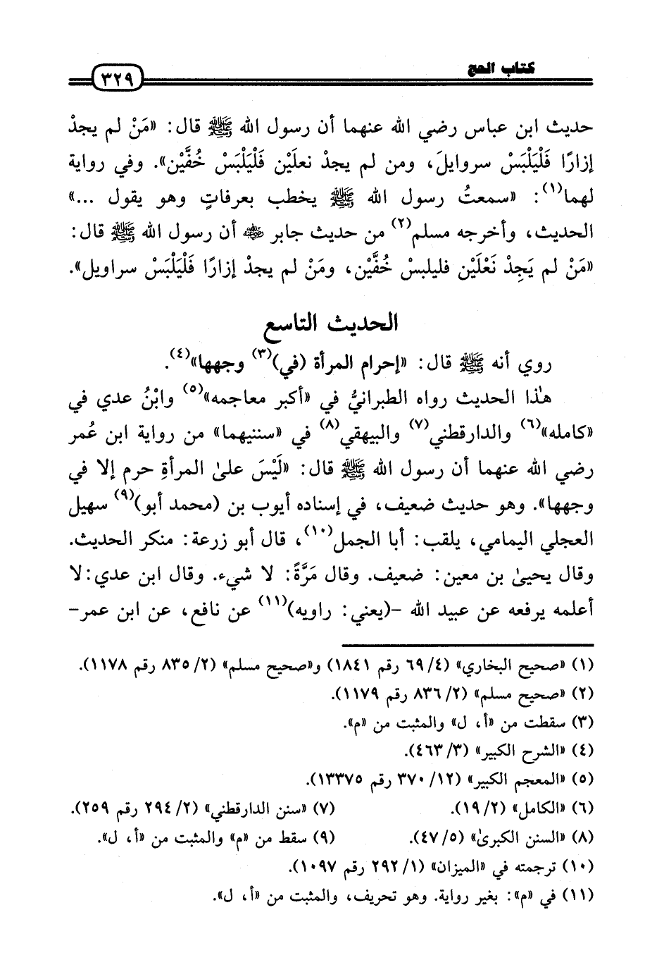 هَذَا الحَدِيث رَوَاهُ الطبرانيُّ فِي «أكبر معاجمه» وابْنُ عدي فِي «كَامِله» وَالدَّارَقُطْنِيّ وَالْبَيْهَقِيّ فِي «سنَنَيْهِمَا» من رِوَايَة ابْن عُمر رَضِيَ اللَّهُ عَنْهما أَن رَسُول الله - صَلَّى الله عَلَيْهِ وَسلم - قَالَ: «لَيْسَ عَلَى المرأةِ حرم إِلَّا فِي وَجههَا» . وَهُوَ حَدِيث ضَعِيف، فِي إِسْنَاده أَيُّوب بن (مُحَمَّد أَبُو) سُهَيْل الْعجلِيّ اليمامي، يلقب: أَبَا الْجمل، قَالَ أَبُو زرْعَة: مُنكر الحَدِيث. وَقَالَ يَحْيَى بن معِين: ضَعِيف. وَقَالَ مَرَّةً: لَا شَيْء. وَقَالَ ابْن عدي: لَا أعلمهُ يرفعهُ عَن عبيد الله - (يَعْنِي: رَاوِيه) عَن نَافِع، عَن ابْن عمر -