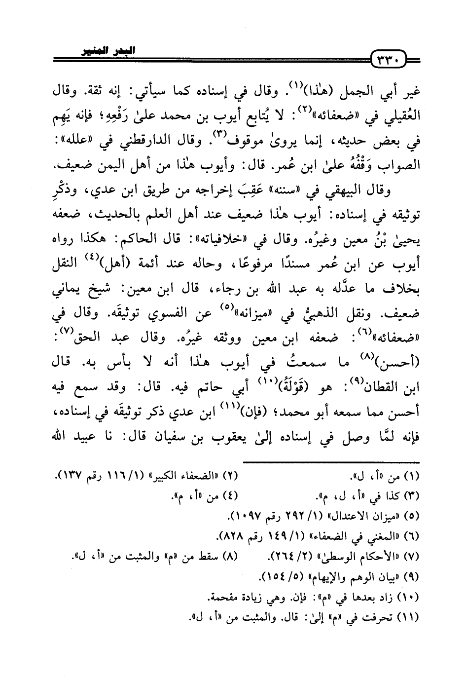 وَقَالَ الْبَيْهَقِيّ فِي «سنَنه» عَقِبَ إِخْرَاجه من طَرِيق ابْن عدي، وذكْرِ توثيقه فِي إِسْنَاده: أَيُّوب هَذَا ضَعِيف عِنْد أهل الْعلم بِالْحَدِيثِ، ضعفه يَحْيَى بْنُ معِين وغيرُه. وَقَالَ فِي «خلافياته» : قَالَ الْحَاكِم: هَكَذَا رَوَاهُ أَيُّوب عَن ابْن عُمر مُسْندًا مَرْفُوعا، وحاله عِنْد أَئِمَّة (أهل) النَّقْل بِخِلَاف مَا عدَّله بِهِ عبد الله بن رَجَاء، قَالَ ابْن معِين: شيخ يماني ضَعِيف. وَنقل الذهبيُّ فِي «مِيزَانه» عَن الْفَسَوِي توثيقَه. وَقَالَ فِي «ضُعَفَائِهِ» : ضعفه ابْنُ معِين وَوَثَّقَهُ غيرُه. وَقَالَ عبد الْحق: (أحسن) مَا سمعتُ فِي أَيُّوب هَذَا أَنه لَا بَأْس بِهِ. قَالَ ابْن الْقطَّان: هُوَ (قَوْلَةُ) أبي حَاتِم فِيهِ. قَالَ: وَقد سمع فِيهِ أحسن مِمَّا سَمعه أَبُو مُحَمَّد؛ (فَإِن) ابْن عدي ذكر توثيقَه فِي إِسْنَاده، فَإِنَّهُ لمَّا وصل فِي إِسْنَاده إِلَى يَعْقُوب بن سُفْيَان قَالَ: نَا عبيد الله