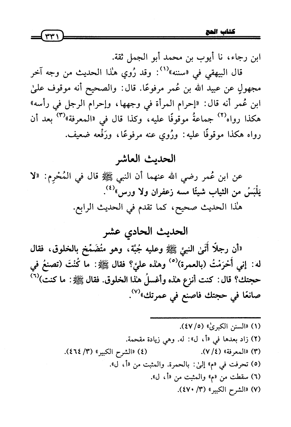 قَالَ الْبَيْهَقِيّ فِي «سنَنه» : وَقد رُوي هَذَا الحَدِيث من وَجه آخر مجهولٍ عَن عبيد الله بن عُمر مَرْفُوعا. قَالَ: وَالصَّحِيح أَنه مَوْقُوف عَلَى ابْن عُمر أَنه قَالَ: «إِحْرَام الْمَرْأَة فِي وَجههَا، وإحرام الرجل فِي رَأسه» هَكَذَا رَوَاهُ جماعةُ مَوْقُوفا عَلَيْهِ، وَكَذَا قَالَ فِي «الْمعرفَة» بعد أَن رَوَاهُ هَكَذَا مَوْقُوفا عَلَيْهِ: ورُوي عَنهُ مَرْفُوعا، ورَفْعه ضَعِيف.