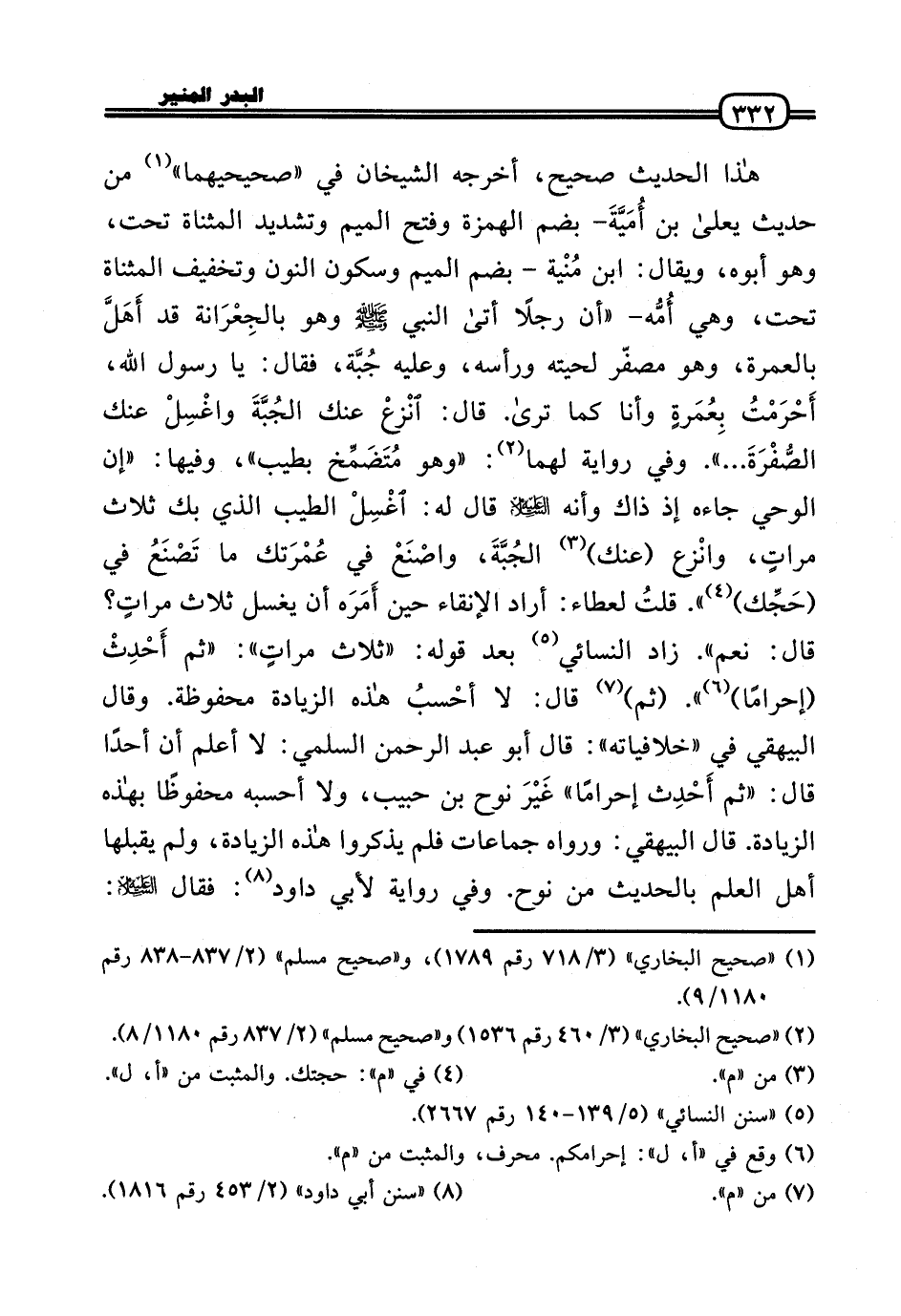 هَذَا الحَدِيث صَحِيح، أخرجه الشَّيْخَانِ فِي «صَحِيحَيْهِمَا» من حَدِيث يعْلى بن أُمَيَّةَ - بِضَم الْهمزَة وَفتح الْمِيم وَتَشْديد الْمُثَنَّاة تَحت، وَهُوَ أَبوهُ، وَيُقَال: ابْن مُنْية - بِضَم الْمِيم وَسُكُون النُّون وَتَخْفِيف الْمُثَنَّاة تَحت، وَهِي أُمُّه - «أَن رجلا أَتَى النَّبِي - صَلَّى الله عَلَيْهِ وَسلم - وَهُوَ بالجِعْرَانة قد أَهَلَّ بِالْعُمْرَةِ، وَهُوَ مصفّر لحيته وَرَأسه، وَعَلِيهِ جُبَّة، فَقَالَ: يَا رَسُول الله، أَحْرَمْتُ بِعُمَرةٍ وَأَنا كَمَا ترَى. قَالَ: انْزعْ عَنْك الجُبَّةَ واغْسِلْ عَنْك الصُّفْرَةَ ... » . وَفِي رِوَايَة لَهما: «وَهُوَ مُتَضَمِّخ بِطيب» ، وفيهَا: «إِن الْوَحْي جَاءَهُ إِذْ ذَاك وَأَنه عَلَيْهِ السَّلَام قَالَ لَهُ: اغْسِلْ الطّيب الَّذِي بك ثَلَاث مراتٍ، وانْزع (عَنْك) الجُبَّةَ، واصْنَعْ فِي عُمْرَتك مَا تَصْنَعُ فِي (حَجِّك) » . قلتُ لعطاء: أَرَادَ الإنقاء حِين أَمَرَه أَن يغسل ثَلَاث مراتٍ؟ قَالَ: نعم» . زَاد النَّسَائِيّ بعد قَوْله: «ثَلَاث مراتٍ» : «ثمَّ أَحْدِثْ (إحرامًا) » . (ثمَّ) قَالَ: لَا أحْسبُ هَذِه الزِّيَادَة مَحْفُوظَة. وَقَالَ الْبَيْهَقِيّ فِي «خلافياته» : قَالَ أَبُو عبد الرَّحْمَن السّلمِيّ: لَا أعلم أَن أحدا قَالَ: «ثمَّ أَحْدِث إحرامًا» غَيْرَ نوح بن حبيب، وَلَا أَحْسبهُ مَحْفُوظًا بِهَذِهِ الزِّيَادَة. قَالَ الْبَيْهَقِيّ: وَرَوَاهُ جماعات فَلم يذكرُوا هَذِه الزِّيَادَة، وَلم يقبلهَا أهل الْعلم بِالْحَدِيثِ من نوح. وَفِي رِوَايَة لأبي دَاوُد: فَقَالَ عَلَيْهِ السَّلَام: