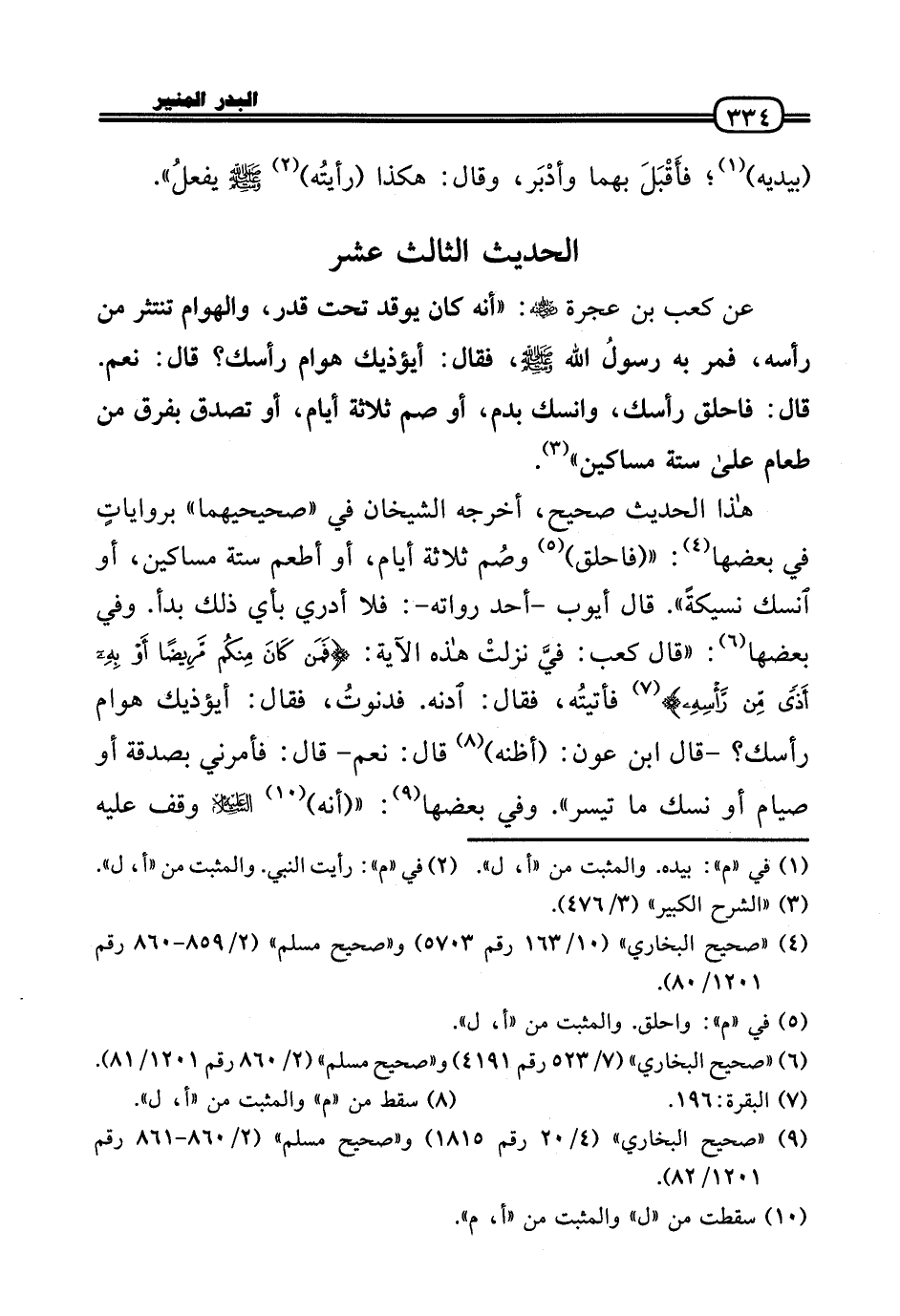 هَذَا الحَدِيث صَحِيح، أخرجه الشَّيْخَانِ فِي «صَحِيحَيْهِمَا» برواياتٍ فِي بَعْضهَا: « (فَاحْلِقْ) وصُم ثَلَاثَة أَيَّام، أَو أطْعم سِتَّة مَسَاكِين، أَو انسك نسيكةً» . قَالَ أَيُّوب - أحد رُوَاته -: فَلَا أَدْرِي بِأَيّ ذَلِك بَدَأَ. وَفِي بَعْضهَا: «قَالَ كَعْب: فيَّ نزلتْ هَذِه الْآيَة: (فَمَنْ كَانَ مِنْكُم مَرِيضا أَو بِهِ أَذَى من رَأسه) فأتيتُه، فَقَالَ: ادنه. فدنوتُ، فَقَالَ: أَيُؤْذِيك هوَام رَأسك؟ - قَالَ ابْن عون: (أَظُنهُ) قَالَ: نعم - قَالَ: فَأمرنِي بِصَدقَة أَو صِيَام أَو نسك مَا تيَسّر» . وَفِي بَعْضهَا: « (أَنه) عَلَيْهِ السَّلَام وقف عَلَيْهِ