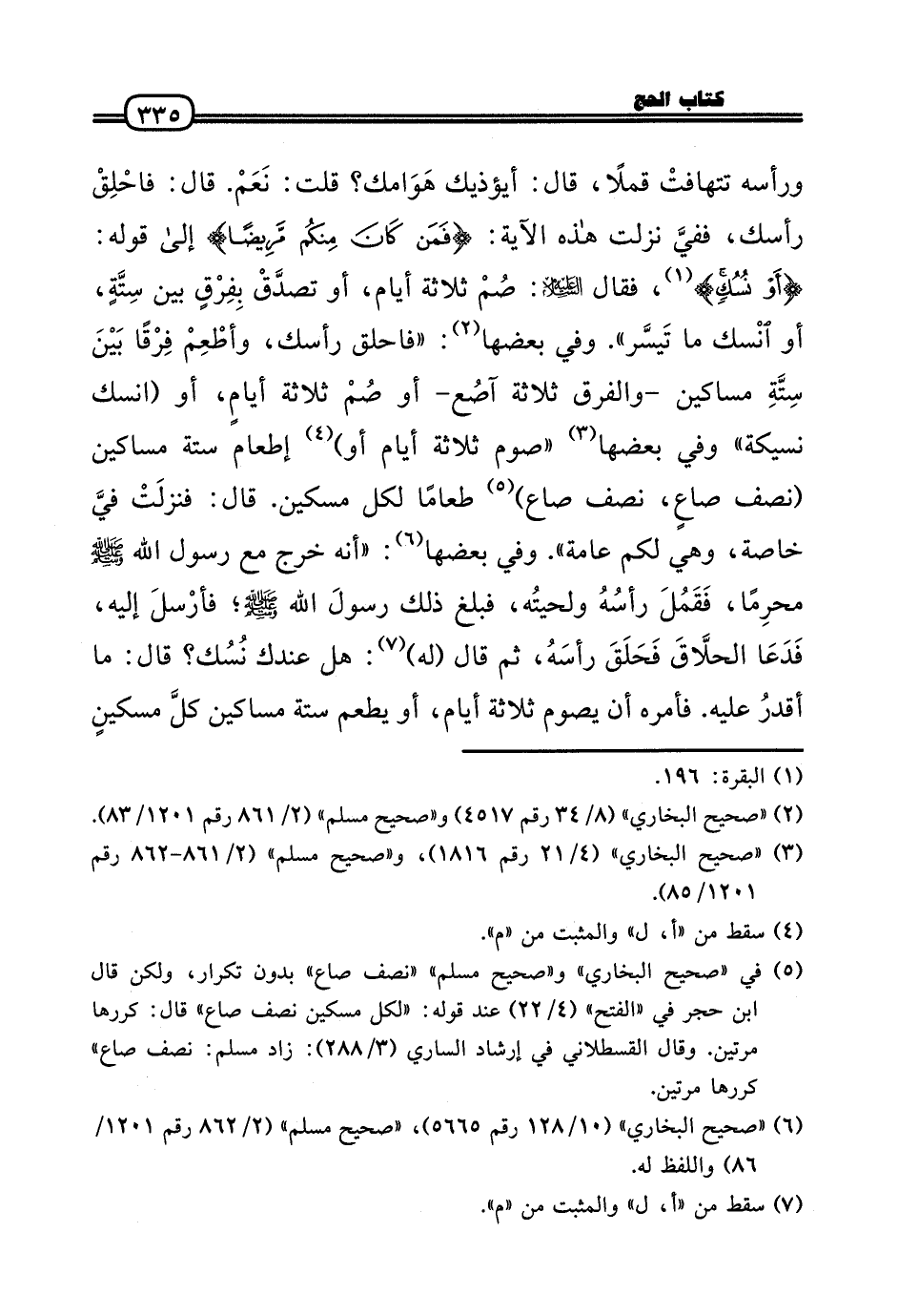 وَرَأسه تتهافتْ قملاً، قَالَ: أَيُؤْذِيك هَوَامك؟ قلت: نَعَمْ. قَالَ: فاحْلِقْ رَأسك، ففيَّ نزلت هَذِه الْآيَة: (فَمَنْ كَانَ مِنْكُم مَرِيضا (إِلَى قَوْله: (أَو نسك) ، فَقَالَ عَلَيْهِ السَّلَام: صُمْ ثَلَاثَة أَيَّام، أَو تصدَّقْ بِفِرْقٍ بَين سِتَّةٍ، أَو انْسك مَا تَيسَّر» . وَفِي بَعْضهَا: «فَاحْلِقْ رَأسك، وأطْعِمْ فِرْقًا بَيْنَ سِتَّةِ مَسَاكِين - وَالْفرق ثَلَاثَة آصُع - أَو صُمْ ثَلَاثَة أيامٍ، أَو (انسك نسيكة» وَفِي بَعْضهَا «صَوْم ثَلَاثَة أَيَّام أَو) إطْعَام سِتَّة مَسَاكِين (نصف صاعٍ، نصف صَاع) طَعَاما لكل مِسْكين. قَالَ: فنزلَتْ فيَّ خَاصَّة، وَهِي لكم عَامَّة» . وَفِي بَعْضهَا: «أَنه خرج مَعَ رَسُول الله - صَلَّى الله عَلَيْهِ وَسلم - محرِمًا، فَقَمُلَ رأسُهُ ولحيتُه، فَبلغ ذَلِك رَسُول الله - صَلَّى الله عَلَيْهِ وَسلم -؛ فأرْسلَ إِلَيْهِ، فَدَعَا الحلاَّقَ فَحَلَقَ رأسَهُ، ثمَّ قَالَ (لَهُ) : هَل عنْدك نُسُك؟ قَالَ: مَا أقدرُ عَلَيْهِ. فَأمره أَن يَصُوم ثَلَاثَة أَيَّام، أَو يطعم سِتَّة مَسَاكِين كلَّ مسكينٍ