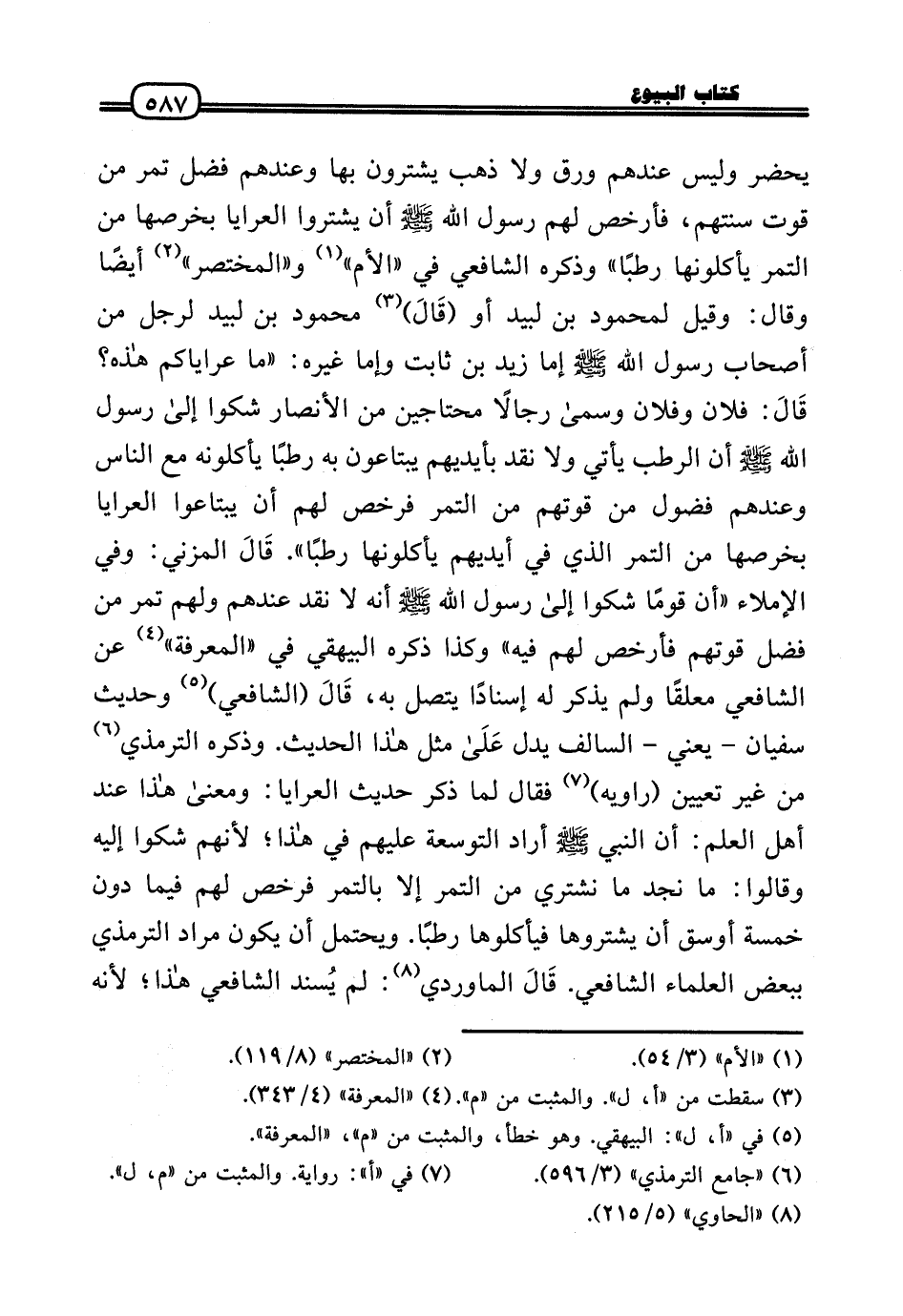 يحضر وَلَيْسَ عِنْدهم ورق وَلَا ذهب يشْتَرونَ بهَا وَعِنْدهم فضل تمر من قوت سنتهمْ، فأرخص لَهُم رَسُول الله - صَلَّى الله عَلَيْهِ وَسلم - أَن يشتروا الْعَرَايَا بِخرْصِهَا من التَّمْر يأكلونها رطبا» وَذكره الشَّافِعِي فِي «الْأُم» و «الْمُخْتَصر» أَيْضا وَقَالَ: وَقيل لمحمود بن لبيد أَو (قَالَ) مَحْمُود بن لبيد لرجل من أَصْحَاب رَسُول الله - صَلَّى الله عَلَيْهِ وَسلم - إِمَّا زيد بن ثَابت وَإِمَّا غَيره: «مَا عراياكم هَذِه؟ قَالَ: فلَان وَفُلَان وَسَمَّى رجَالًا مُحْتَاجين من الْأَنْصَار شكوا إِلَى رَسُول الله - صَلَّى الله عَلَيْهِ وَسلم - أَن الرطب يَأْتِي وَلَا نقد بِأَيْدِيهِم يبتاعون بِهِ رطبا يَأْكُلُونَهُ مَعَ النَّاس وَعِنْدهم فضول من قوتهم من التَّمْر فَرخص لَهُم أَن يبتاعوا الْعَرَايَا بِخرْصِهَا من التَّمْر الَّذِي فِي أَيْديهم يأكلونها رطبا» . قَالَ الْمُزنِيّ: وَفِي الْإِمْلَاء «أَن قوما شكوا إِلَى رَسُول الله - صَلَّى الله عَلَيْهِ وَسلم - أَنه لَا نقد عِنْدهم وَلَهُم تمر من فضل قوتهم فأرخص لَهُم فِيهِ» وَكَذَا ذكره الْبَيْهَقِيّ فِي «الْمعرفَة» عَن الشَّافِعِي مُعَلّقا وَلم يذكر لَهُ إِسْنَادًا يتَّصل بِهِ، قَالَ (الشَّافِعِي) وَحَدِيث سُفْيَان - يَعْنِي - السالف يدل عَلَى مثل هَذَا الحَدِيث. وَذكره التِّرْمِذِيّ من غير تعْيين (رَاوِيه) فَقَالَ لما ذكر حَدِيث الْعَرَايَا: وَمَعْنى هَذَا عِنْد أهل الْعلم: أَن النَّبِي - صَلَّى الله عَلَيْهِ وَسلم - أَرَادَ التَّوسعَة عَلَيْهِم فِي هَذَا؛ لأَنهم شكوا إِلَيْهِ وَقَالُوا: مَا نجد مَا نشتري من التَّمْر إِلَّا بِالتَّمْرِ فَرخص لَهُم فِيمَا دون خَمْسَة أوسق أَن يشتروها فيأكلوها رطبا. وَيحْتَمل أَن يكون مُرَاد التِّرْمِذِيّ بِبَعْض الْعلمَاء الشَّافِعِي. قَالَ الْمَاوَرْدِيّ: لم يُسند الشَّافِعِي هَذَا؛ لِأَنَّهُ