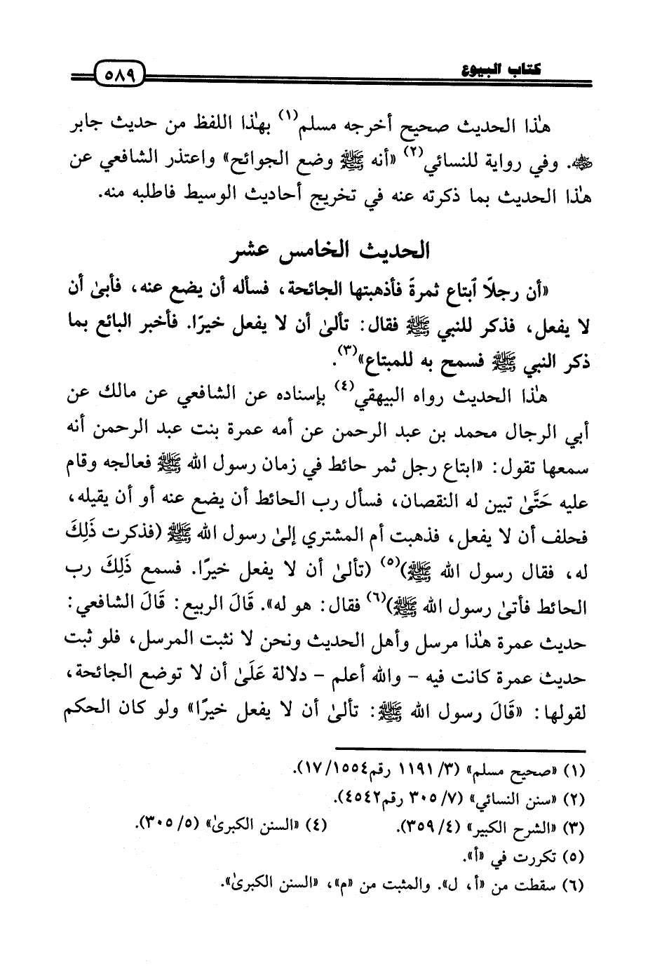 هَذَا الحَدِيث رَوَاهُ الْبَيْهَقِيّ بِإِسْنَادِهِ عَن الشَّافِعِي عَن مَالك عَن أبي الرِّجَال مُحَمَّد بن عبد الرَّحْمَن عَن أمه عمْرَة بنت عبد الرَّحْمَن أَنه سَمعهَا تَقول: «ابْتَاعَ رجل ثَمَر حَائِط فِي زمَان رَسُول الله - صَلَّى الله عَلَيْهِ وَسلم - فعالجه وَقَامَ عَلَيْهِ حَتَّى تبين لَهُ النُّقْصَان، فَسَأَلَ رب الْحَائِط أَن يضع عَنهُ أَو أَن يقيله، فَحلف أَن لَا يفعل، فَذَهَبت أم المُشْتَرِي إِلَى رَسُول الله - صَلَّى الله عَلَيْهِ وَسلم - (فَذكرت ذَلِكَ لَهُ، فَقَالَ رَسُول الله - صَلَّى الله عَلَيْهِ وَسلم -) (تألى أَن لَا يفعل خيرا. فَسمع ذَلِكَ رب الْحَائِط فَأَتَى رَسُول الله - صَلَّى الله عَلَيْهِ وَسلم -) فَقَالَ: هُوَ لَهُ» . قَالَ الرّبيع: قَالَ الشَّافِعِي: حَدِيث عمْرَة هَذَا مُرْسل وَأهل الحَدِيث وَنحن لَا نثبت الْمُرْسل، فَلَو ثَبت حَدِيث عمْرَة كَانَت فِيهِ - وَالله أعلم - دلَالَة عَلَى أَن لَا تُوضَع الْجَائِحَة، لقولها: «قَالَ رَسُول الله - صَلَّى الله عَلَيْهِ وَسلم -: تألى أَن لَا يفعل خيرا» وَلَو كَانَ الحكم